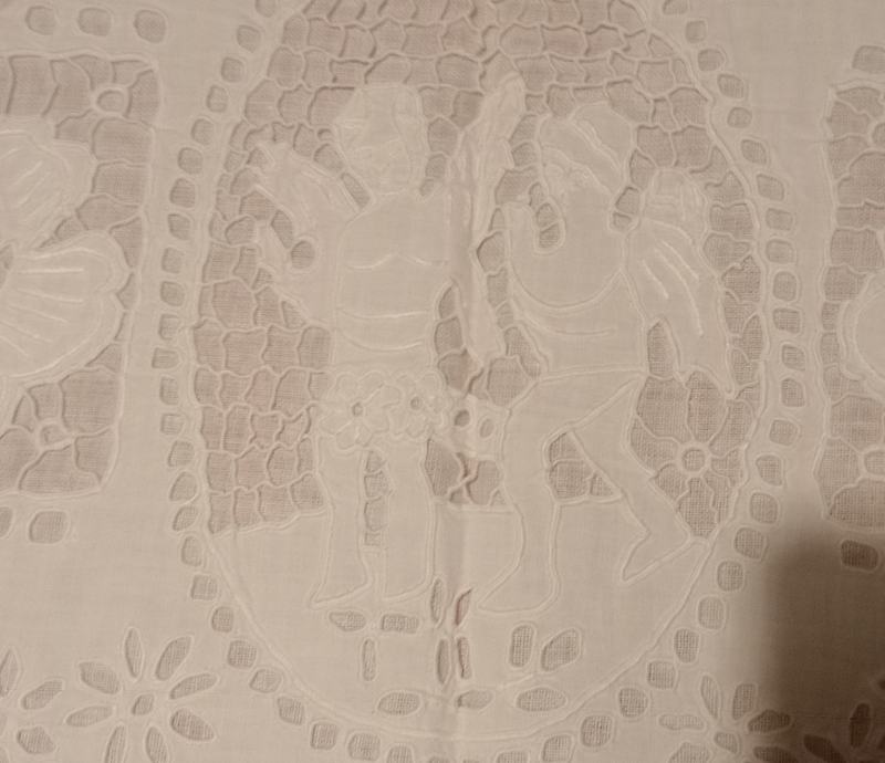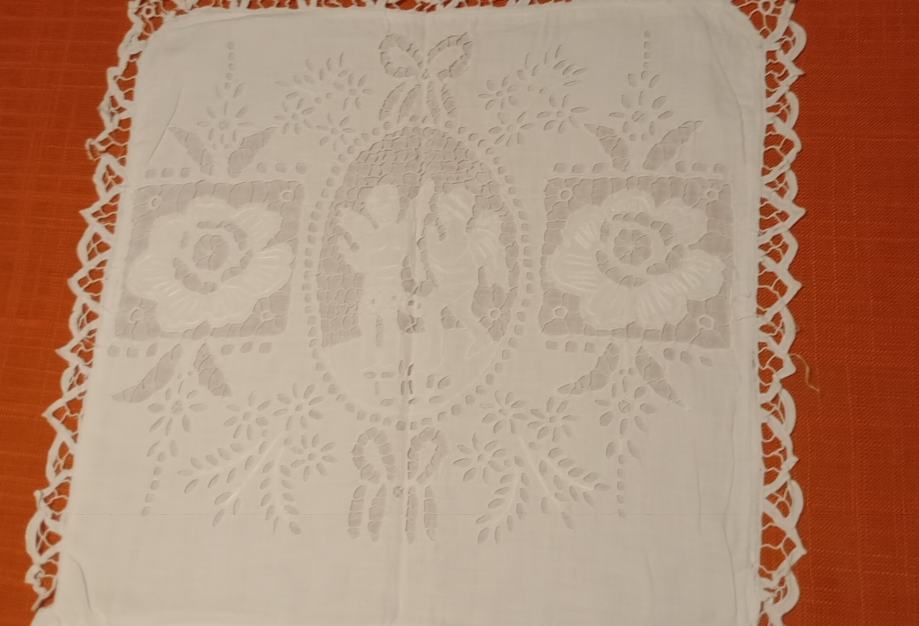 Starinska jastučnica, motiv Andjeli uz ostalo, ručni rad na doma em platnu. 42 X 40 cm.