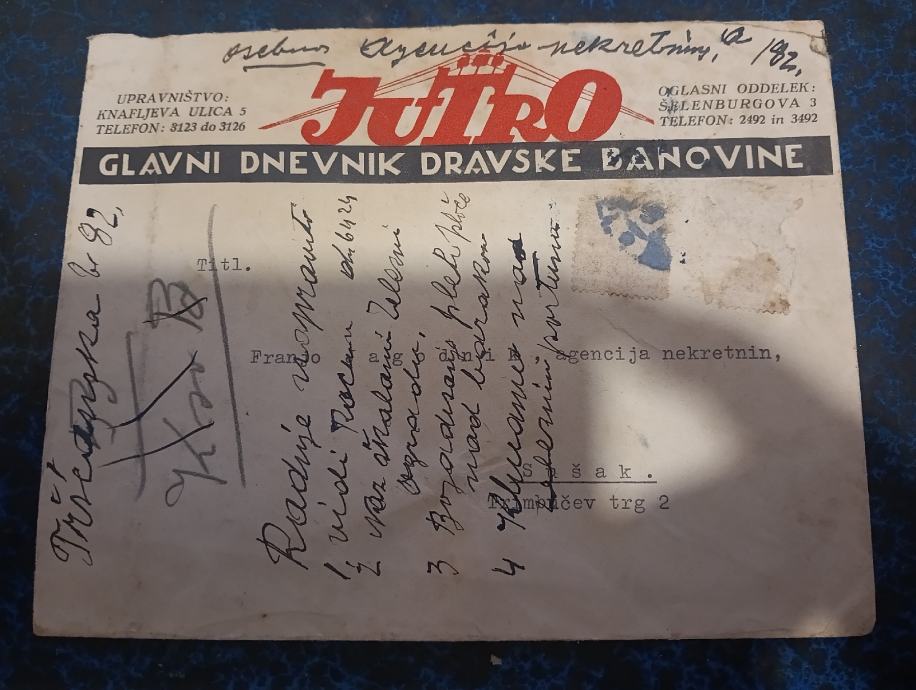 Prodajem staru kovertu iz 30ih godina Jutro, glavnog dnevnika Dravske banovine. Plačanje na račun ili gotovina.