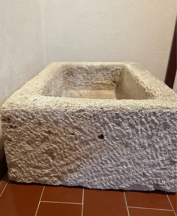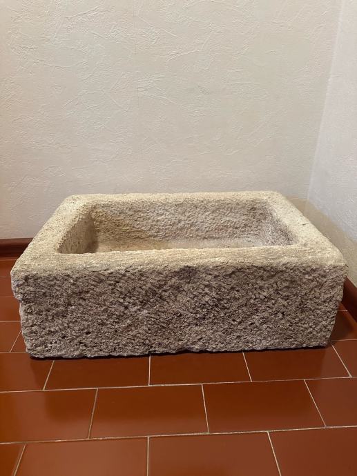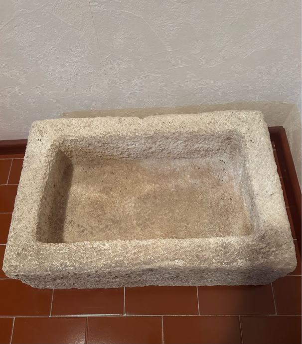 Ručno klesana stara dalmatinska kamenica, bez poklopca. Dobro očuvana. Dimenzije: 64 cm dužina, 42 cm širina i 22 cm visina.