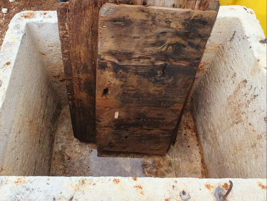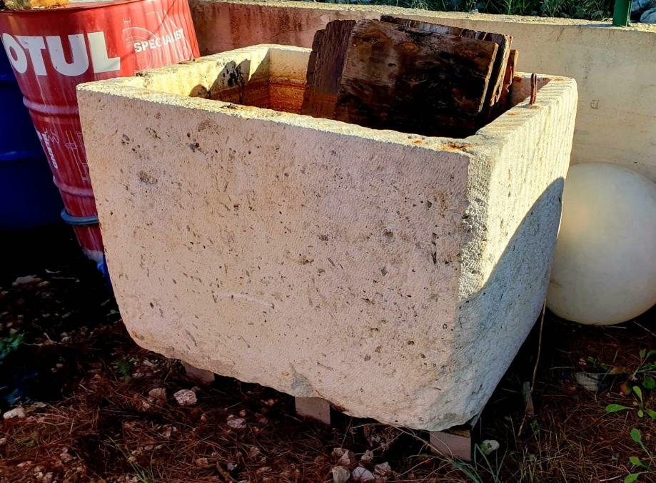 Ručno klesana dalmatinska kamenica, bez poklopca. Vanjske dimenzije kamenice su 92 × 67 x dubina 66 cm (unutarnje cca 78 × 53 × 60 cm). Debljina stijenke 7 cm a kapacitet cca 250 litara. Kamenica se nalazi na paleti i lako je dostupna za odvoz kamionom...