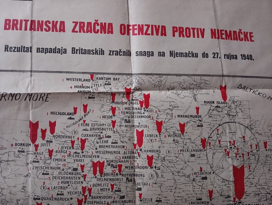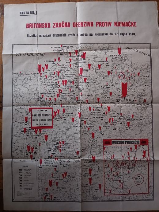 Prodajem originalnu kartu sa rezultatima napada Britanskih zračnih snaga na Njemačku 27.09 1940g. Dimenzije karte po dužini 47.5cm a po visini 63cm. Stanje odlično.