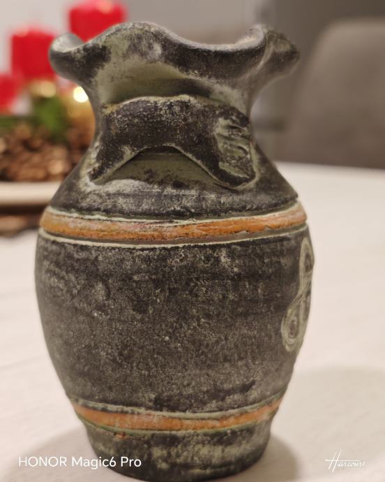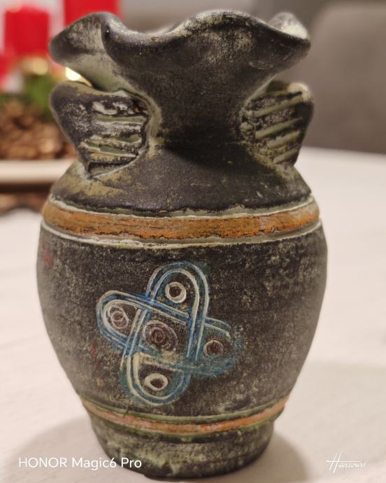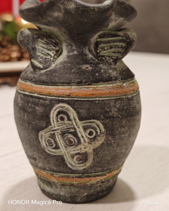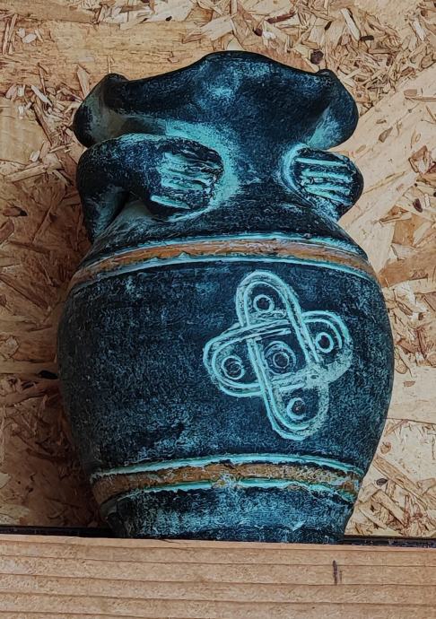 Dizajn: Ima tamnu, rustikalnu završnu obradu i karakterističan dvostruki dizajn ručki. Središnji motiv na trbuhu vaze je simbol plave i bijele boje koji nalikuje keltskom čvoru ili ukrasu.