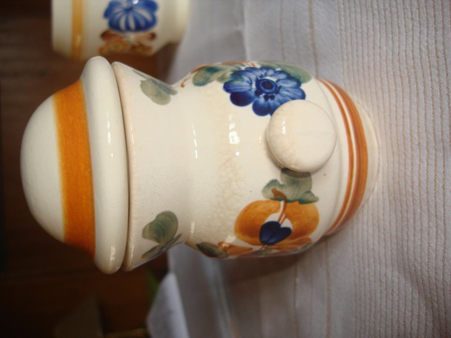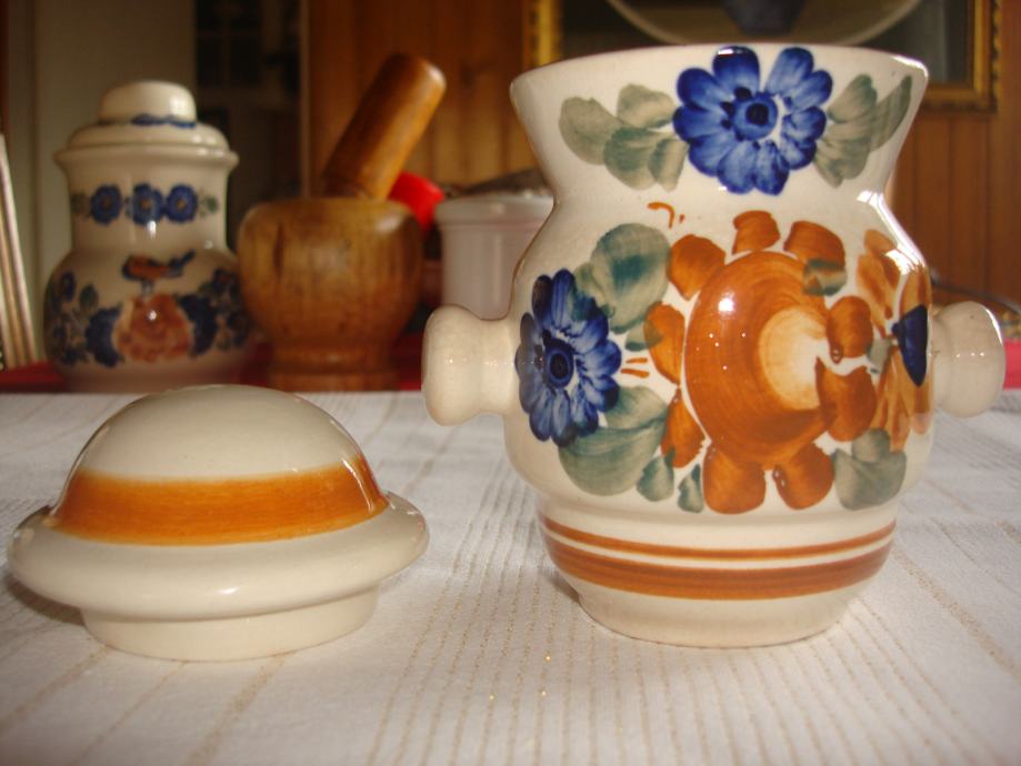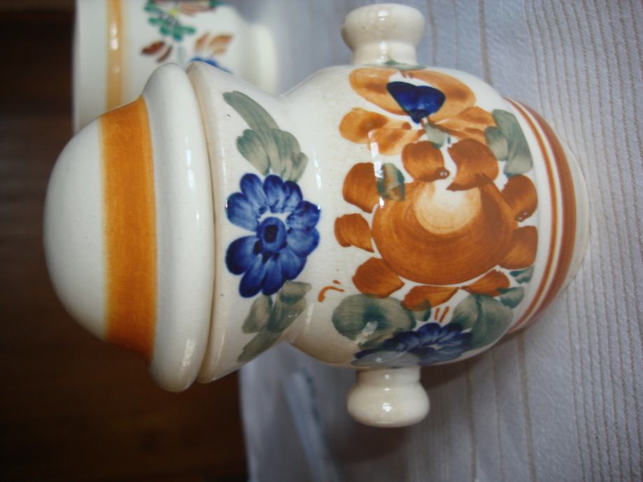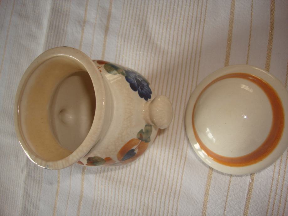 Prodajem oslikanu keramičku posudu s dvije ručkice, s poklopcem, visine 14 cm (bez poklopca 10,5 cm) i najšireg promjera 9 cm, potpuno očuvanu za 7 eura. Poljska keramika.