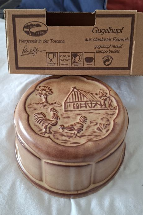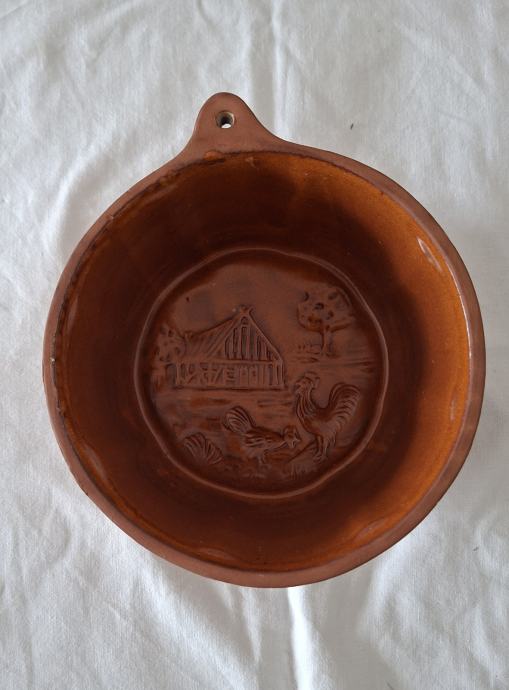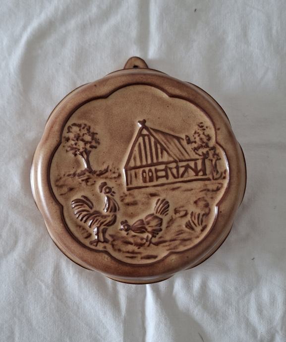 Vintage nekorišten okrugli keramički kalup/zdijelica reljefne izrade. Može se objesiti i tako ukrašavati kuhinju i kad nije u upotrebi.