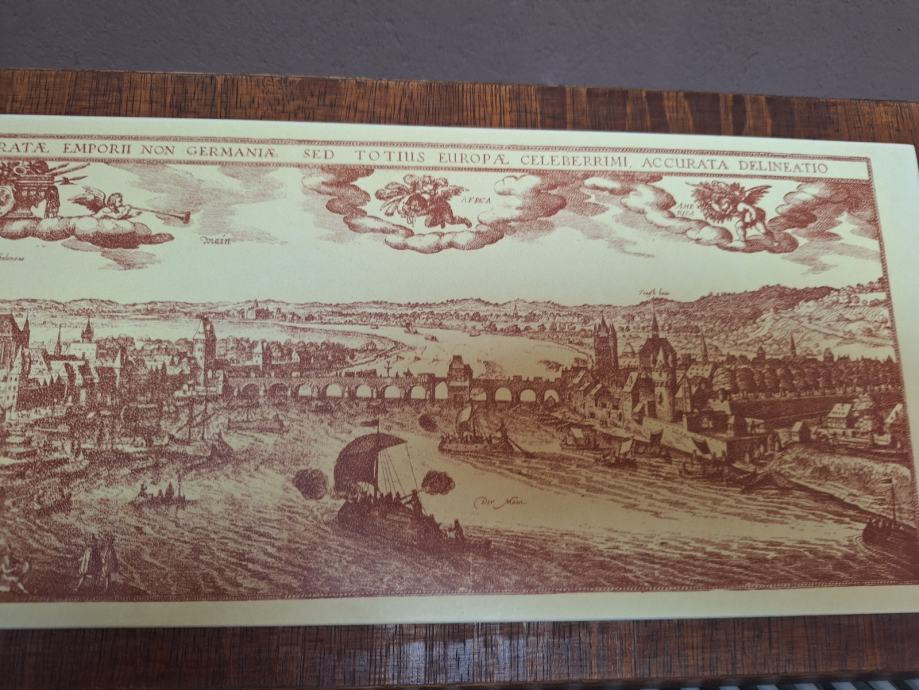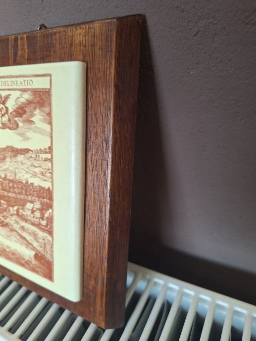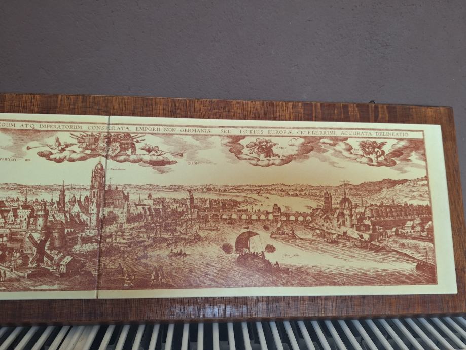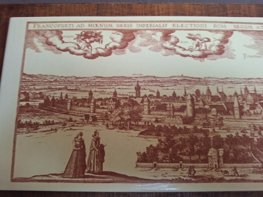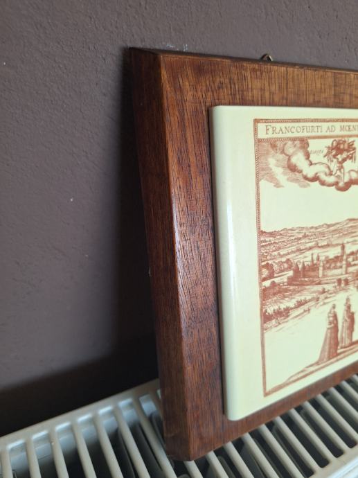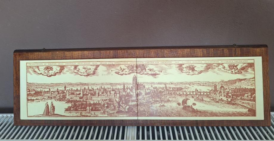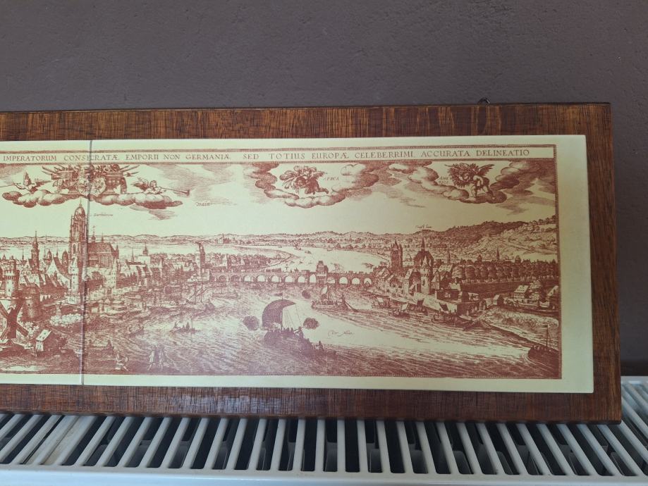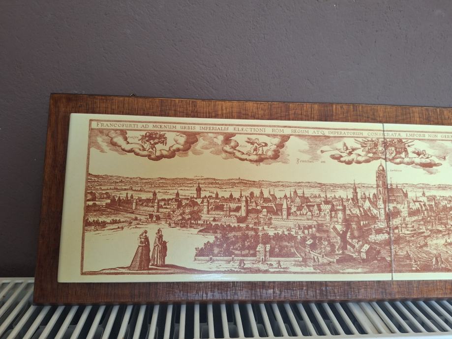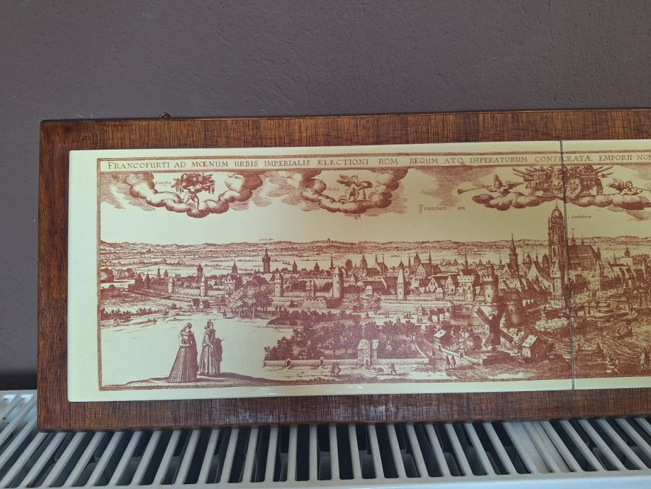 Prodajem dekorativni panel sa motivom povijesne panorame Frankfurta na Majni. Motiv je reprodukcija stare gravure na keramičkim pločicama, montiran na drvenu podlogu.