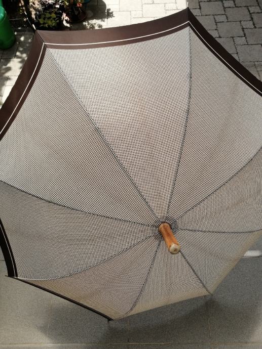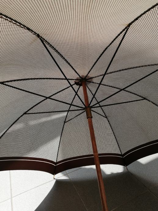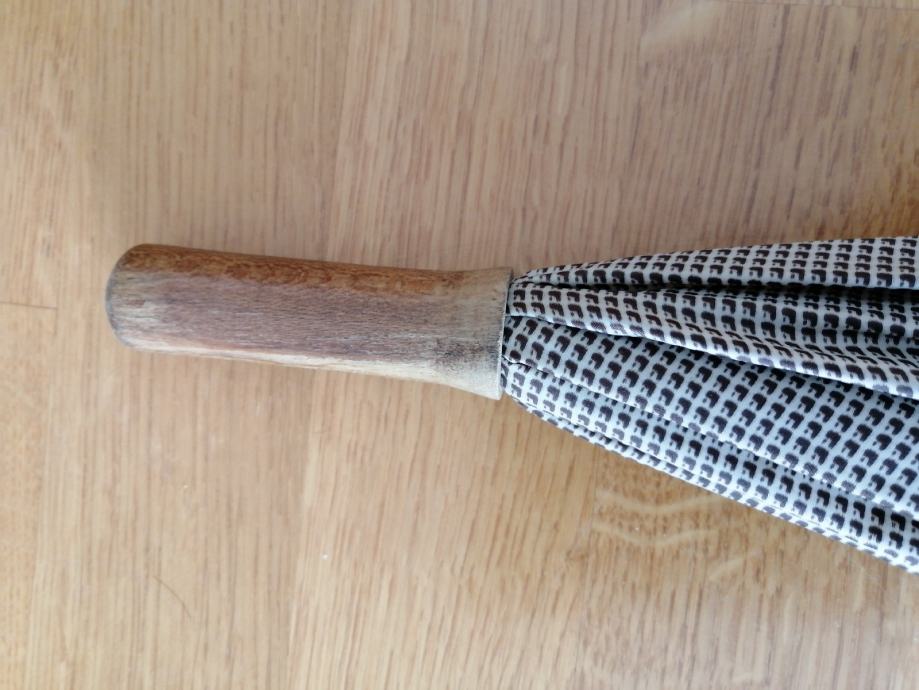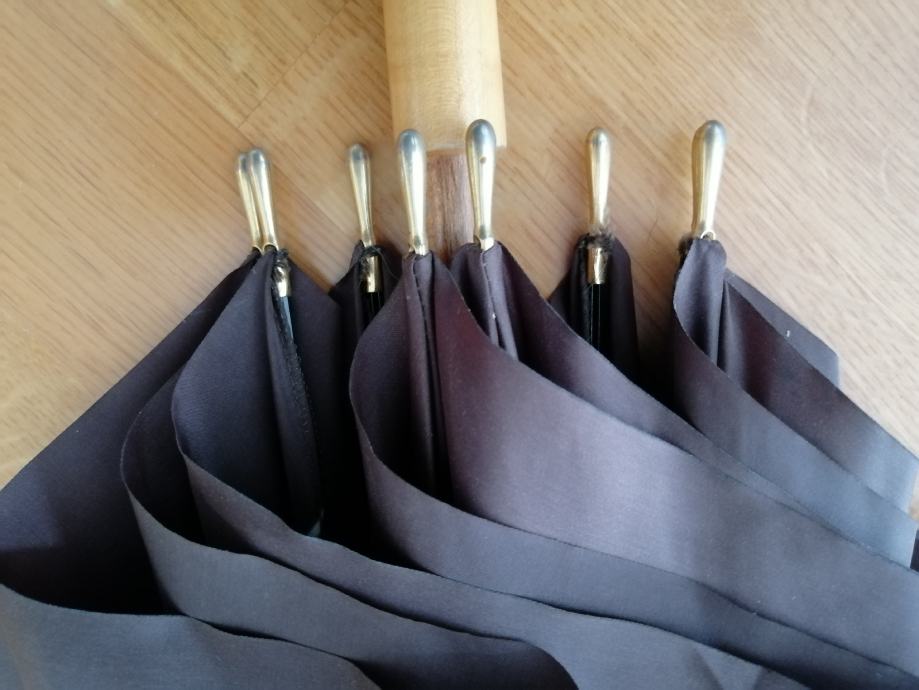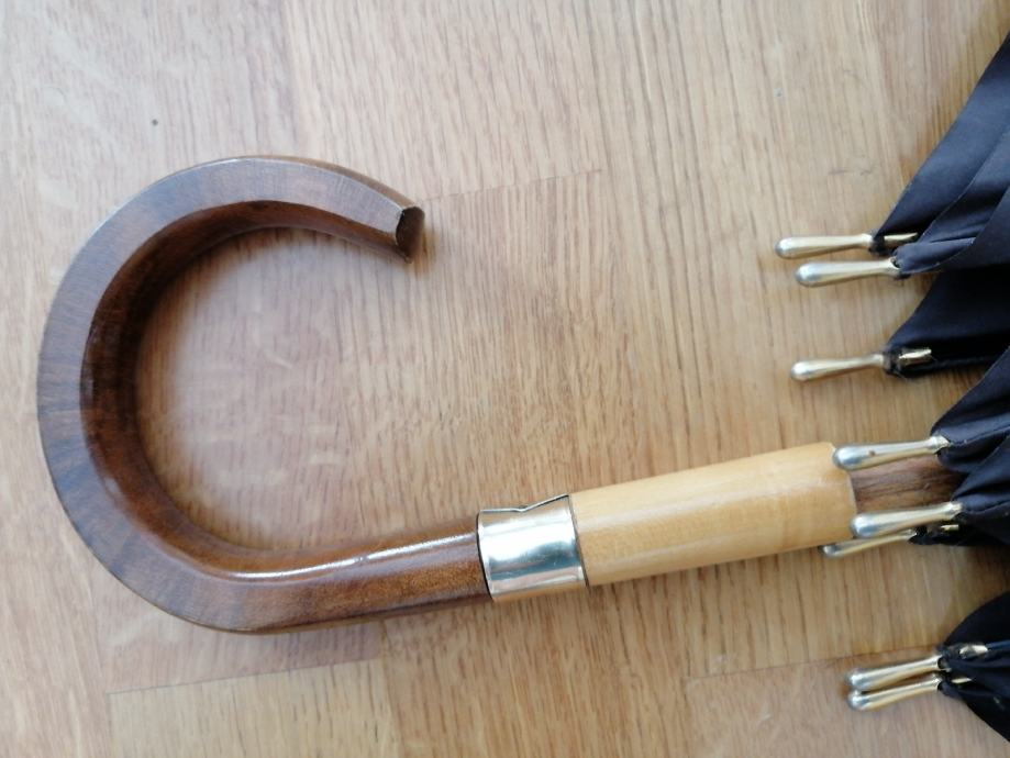 Kišobran s drvenom ručkom i metalnim prstenom za spremanje, u odličnom stanju, potpuno funkcionalan i neoštećen.
