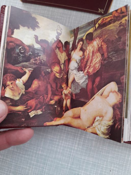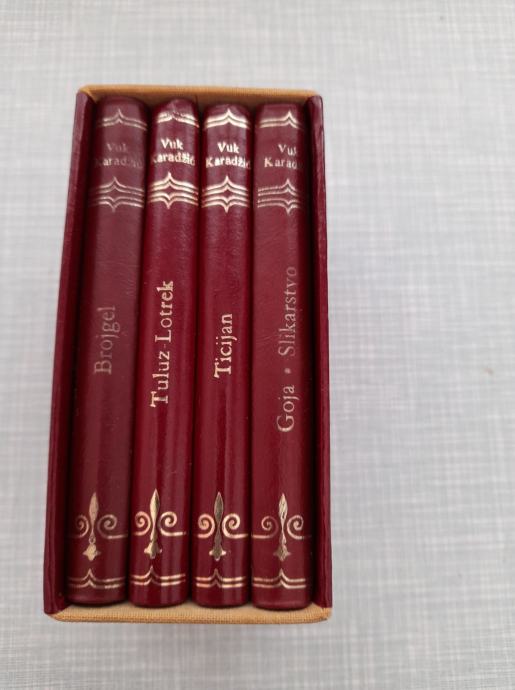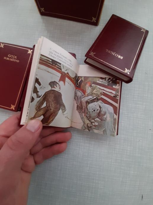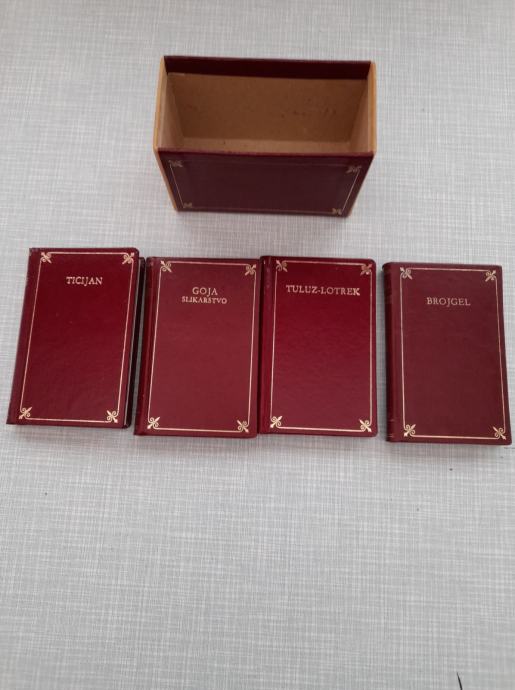 knjiga 4 slikara ticijan, goja, tuluz-lotrek, brojgel, dimenzije knjige 10,7x7, dimenzije kutije 11,3x7,5, izdana je 1977, vidi slike
