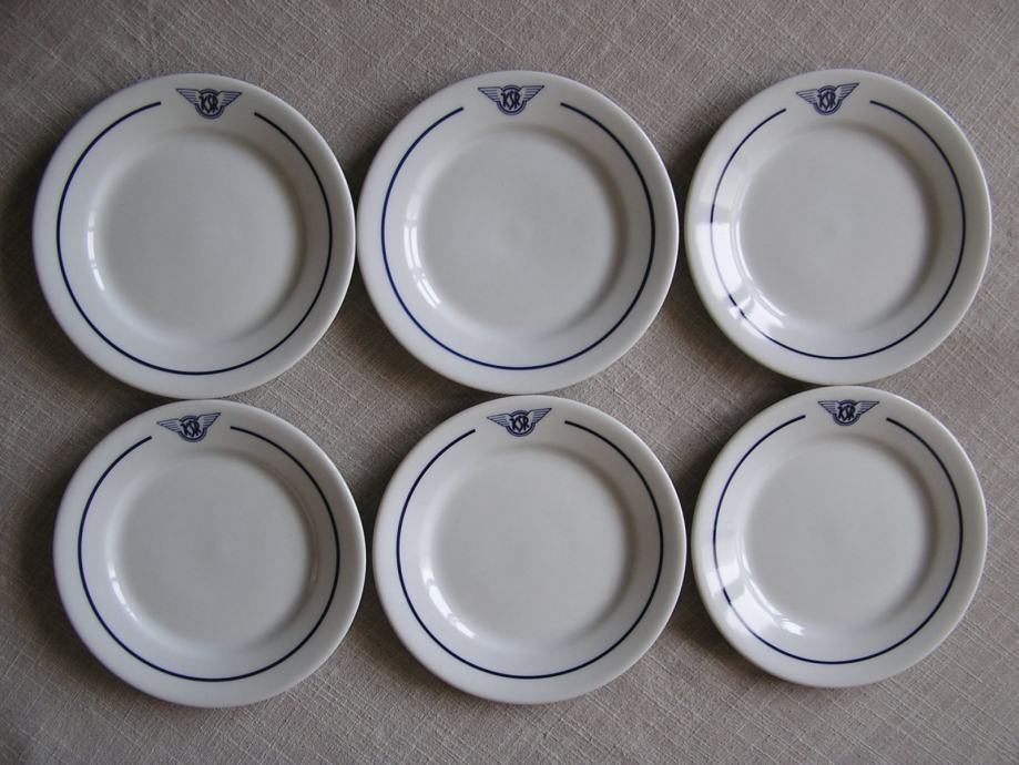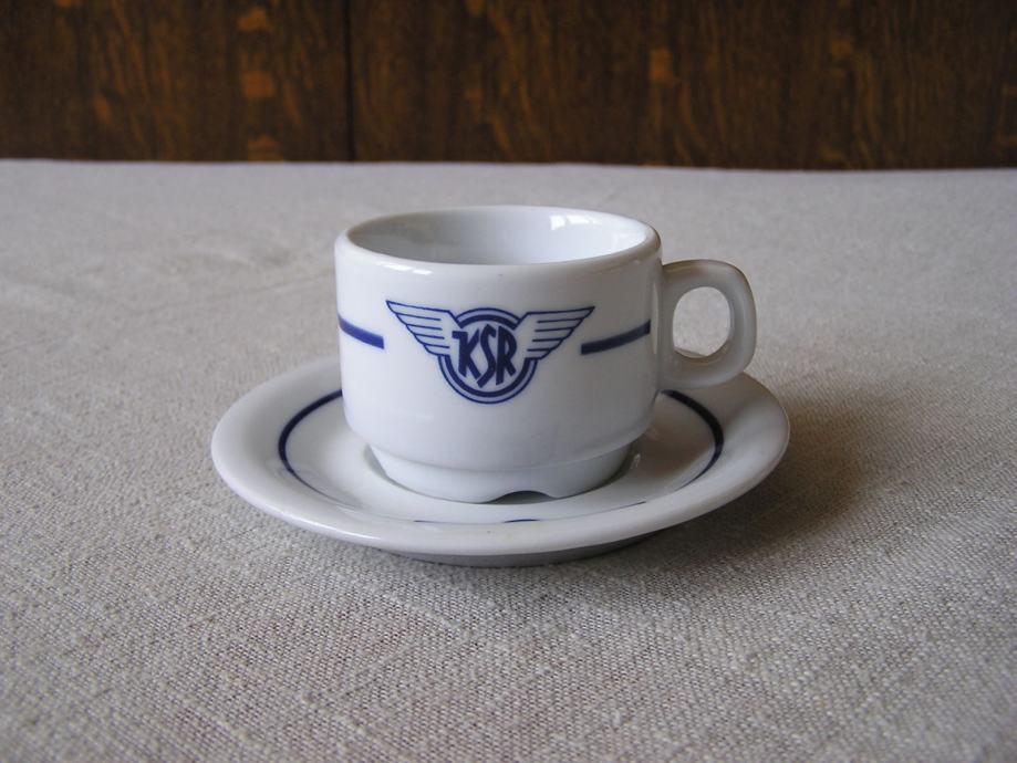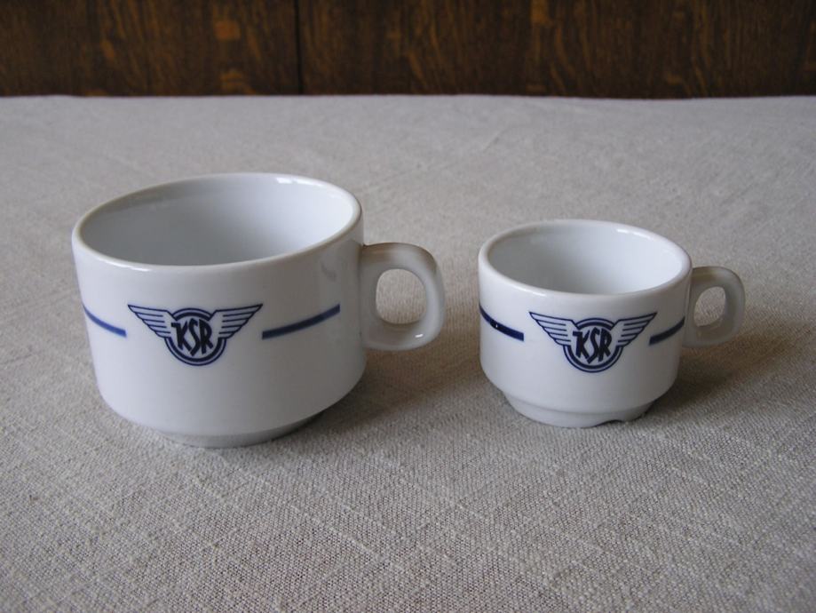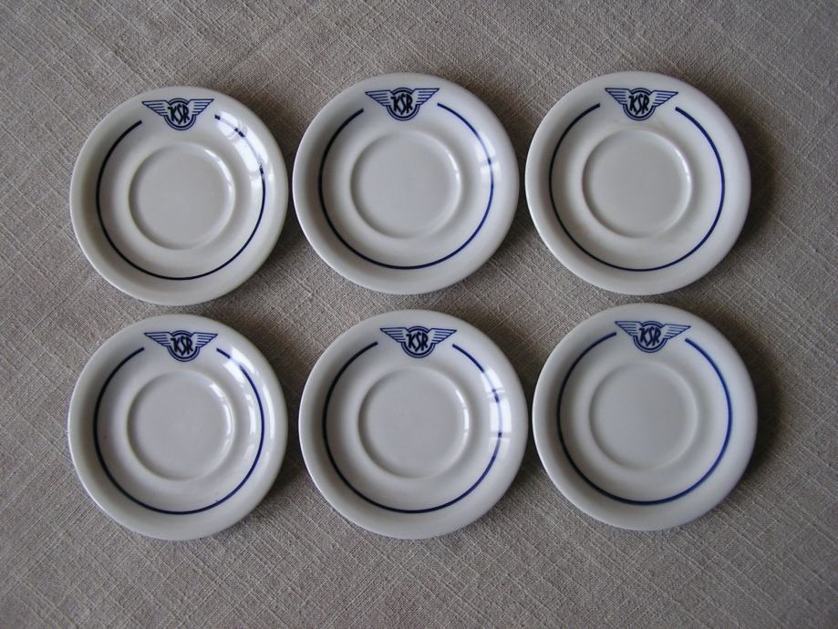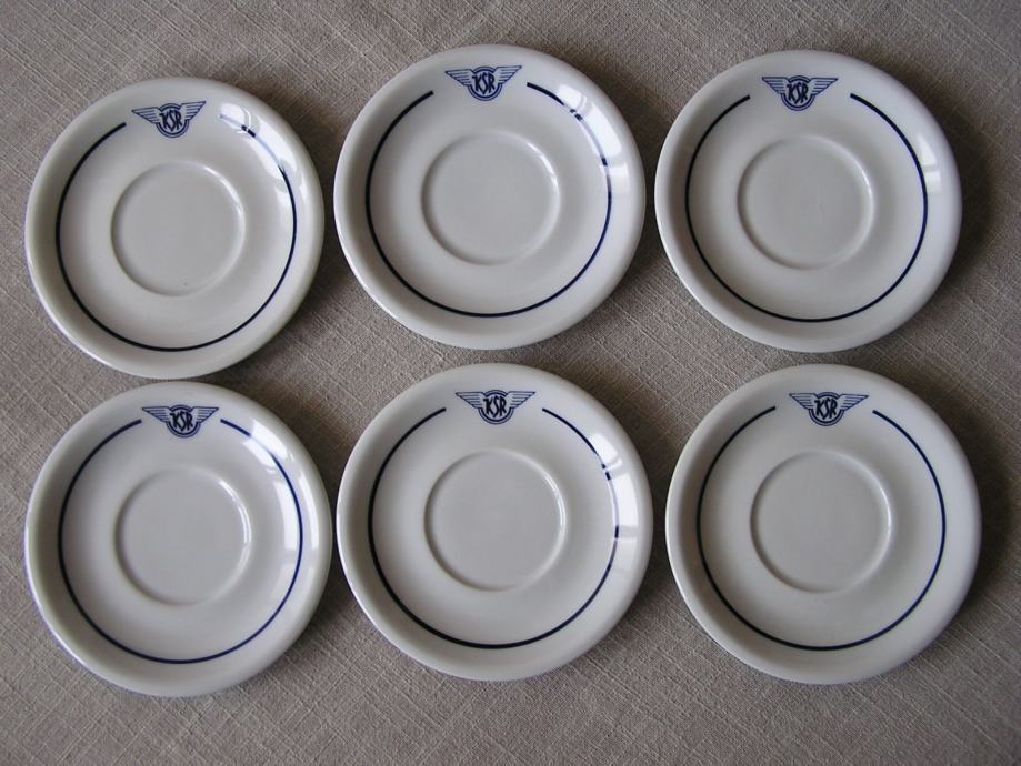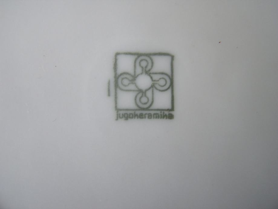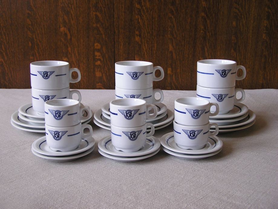 Veliki kolekcionarski set, desertni tanjuri, velike šalice sa pripadajućim tanjurićima, male šalice sa pripadajućim tanjurićima, sve po 6 komada, ukupno 30 komada. Iz 1980ih, sa oznakom "KSR" - Kola za spavanje i ručavanje koja su bila sastavni dio tadašnjih vlakova Jugoslavenske željeznice. Na 2 tanjurića od malih šalica je na stražnjoj strani površinski ispucala caklina s prednje strane nema napuklina (zadnja slika). Na tanjurima ima nešto tragova od korištenja, sve ostalo je u redu. Sve je izradila bivša Jugokeramika Zaprešić.