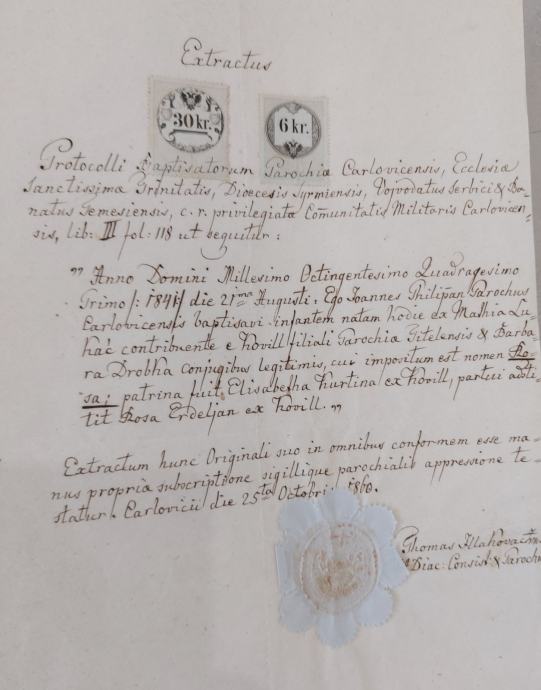 Dokumenti iz Zemuna, Srijemskih Karlovaca, Sombora, Banata (Vojvodstvo Srbija i Tamiški Banat) te Smolenica (Slovačka).