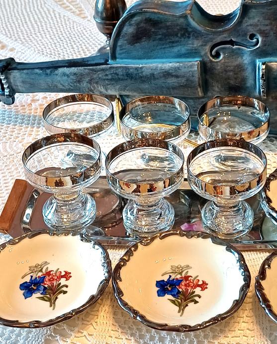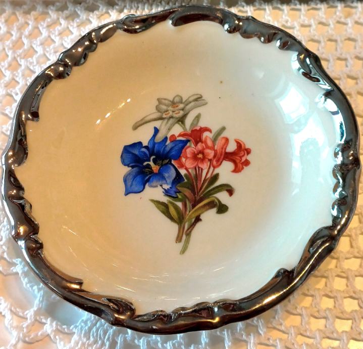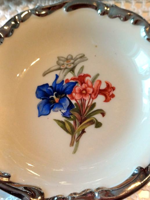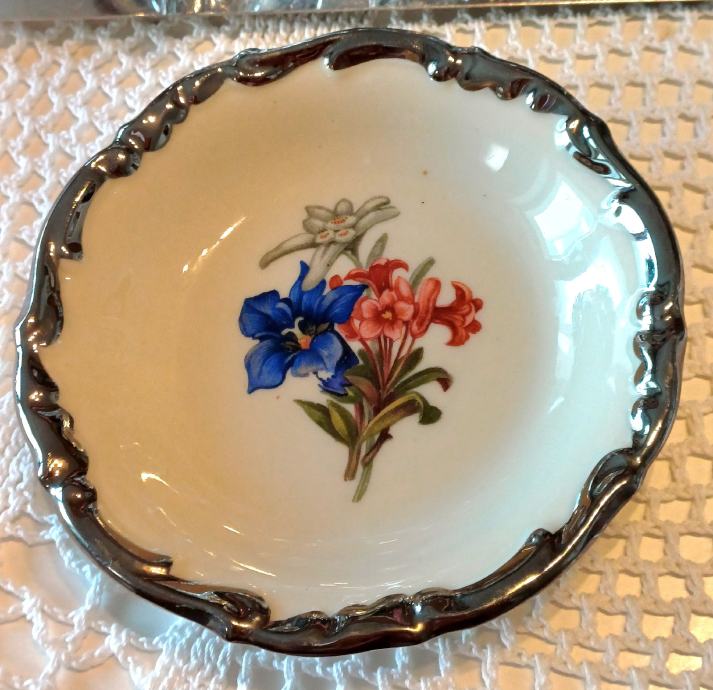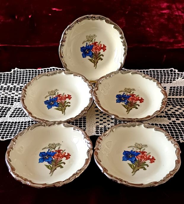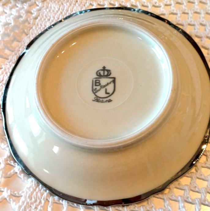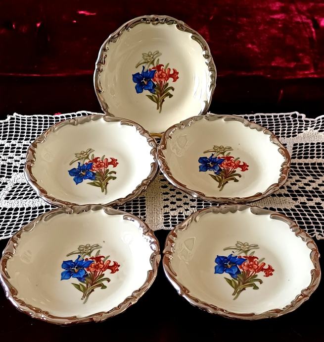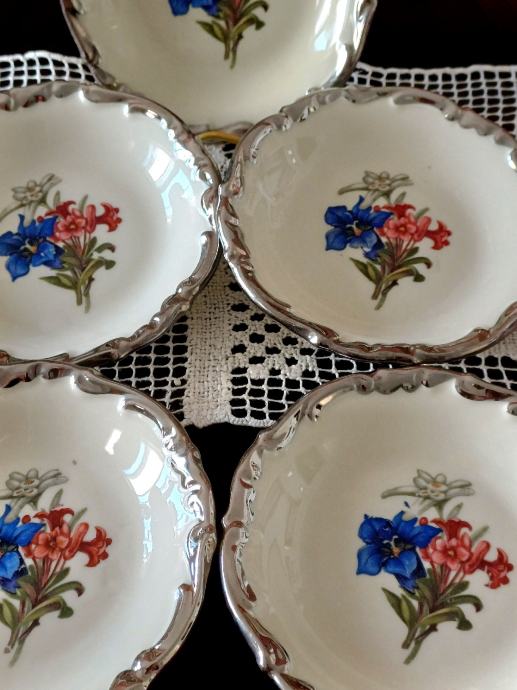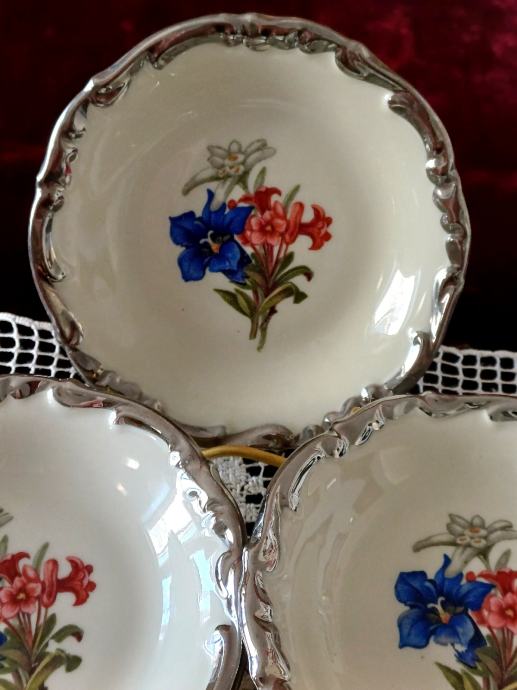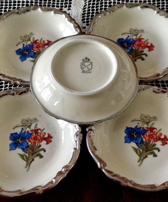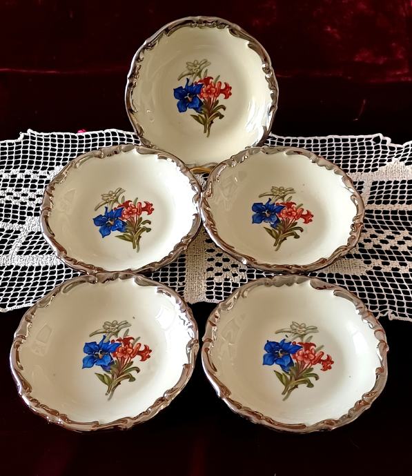 Kolekcionarski Bueer und Lehman, porculanski tanjuri za minjone s platinastim rubom. Promjer 11 cm. U kompletu je 5 tanjurića.