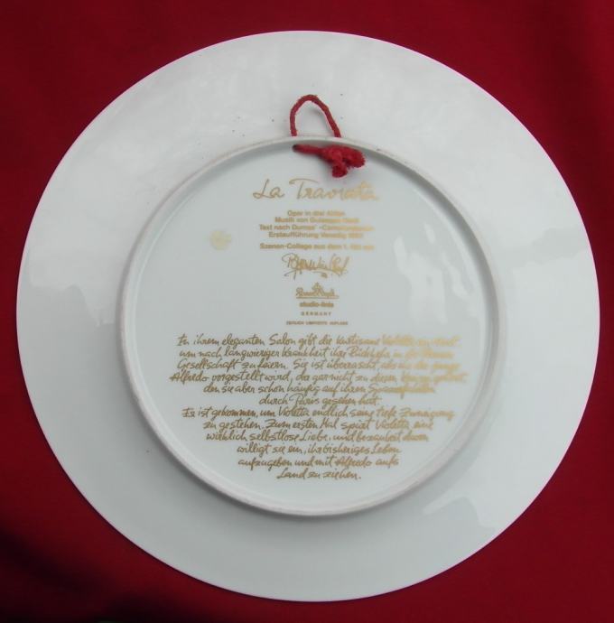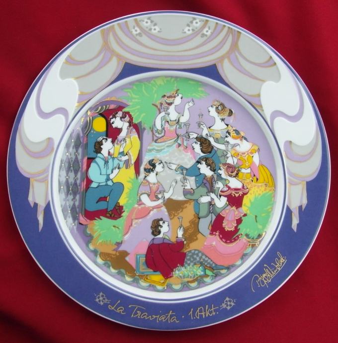 Veliki zidni tanjur, promjera 31 cm, težine 0,975 kg. Rabljen, ali u izvrsnom stanju, bez oštećenja, pukotina, popravaka ili ogrebotina, prva kvaliteta. Tanjur je ukrašen fantastičnim bojama i zlatom, dizajnirao Bjorn Wiinblad, Rosenthal Studio Line Njemačka. Uzorak tanjura zvao se "Asimmetria". Tanjur prikazuje prvi čin Verdijeve opere La Traviata.