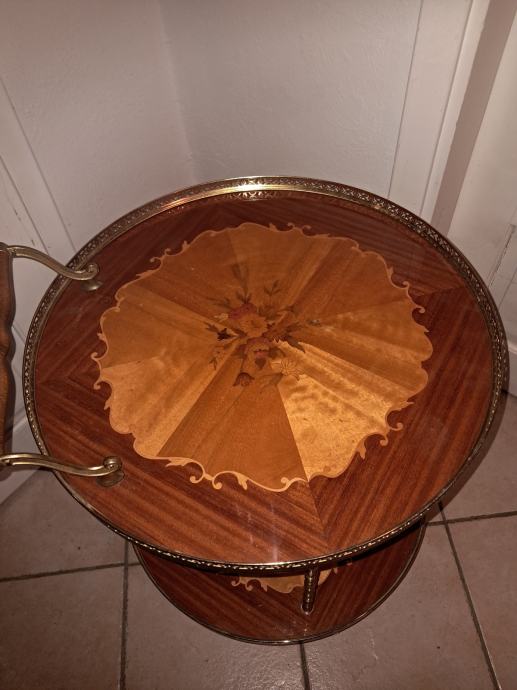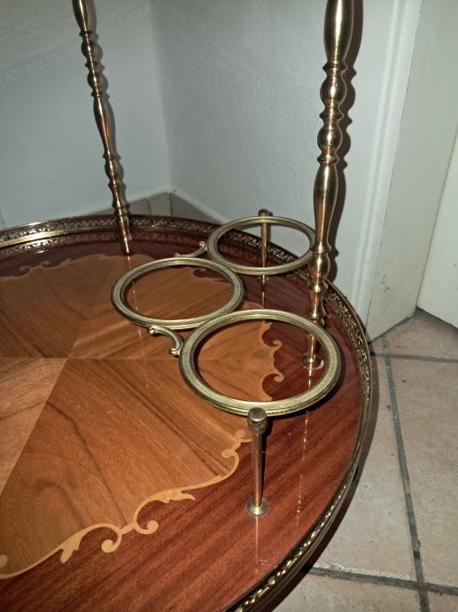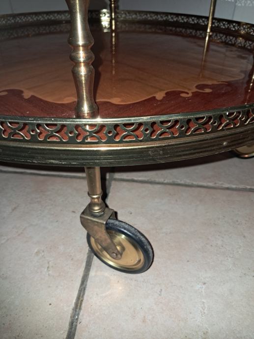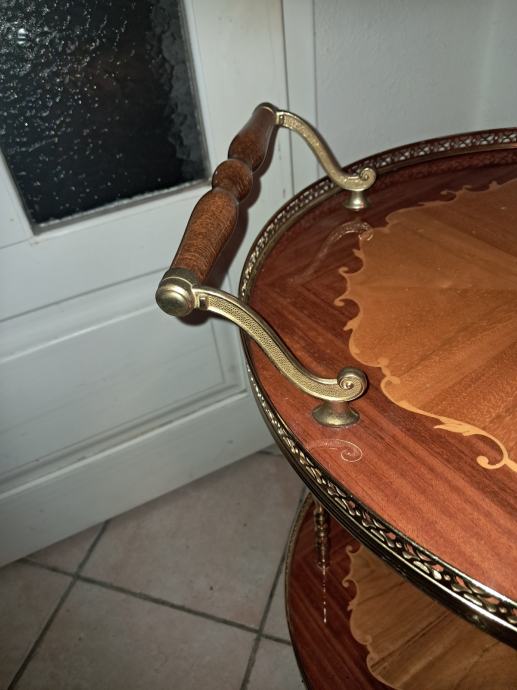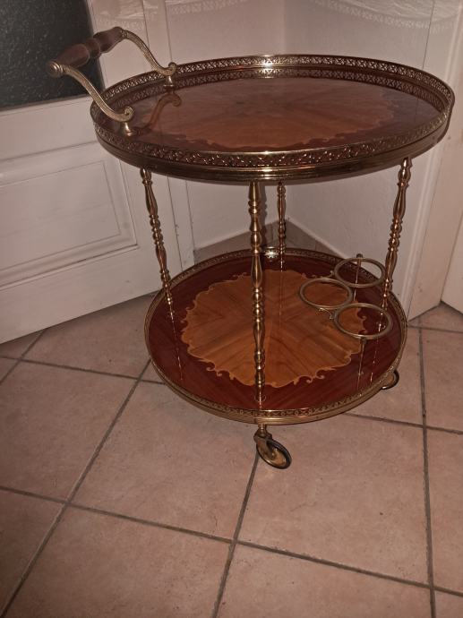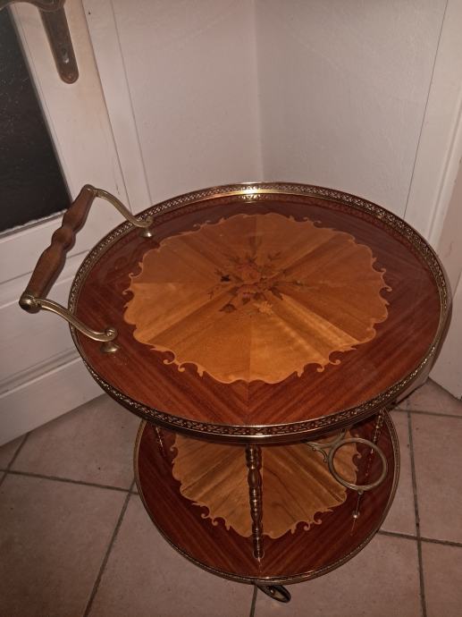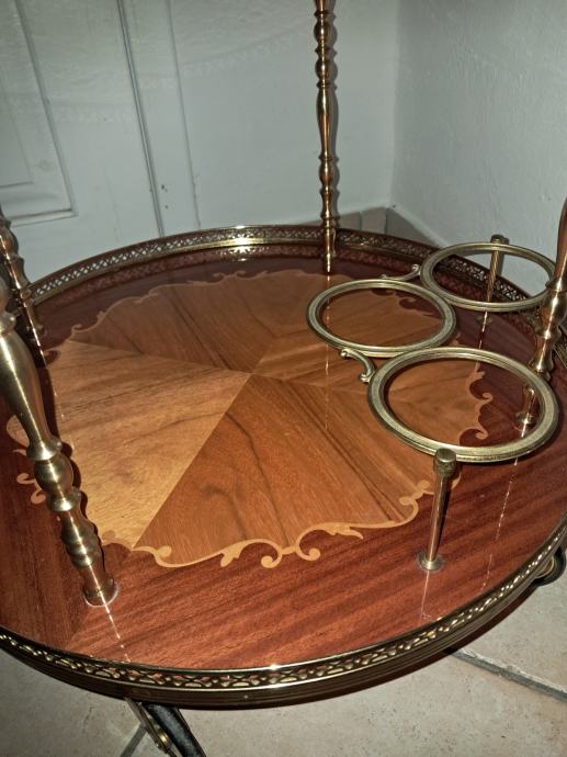 Kolica za posluživanje su izradena od drva i metala. I maju dvije police s intarzijama za odlaganje čaša, boca i sl