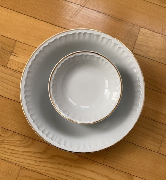 Prekrasan komplet poljskog porculana s pozlaćenim rubom, sastoji se od velike zdjele i 6 malih zdjela... porculan ima reljefan rub, savrseno je očuvan