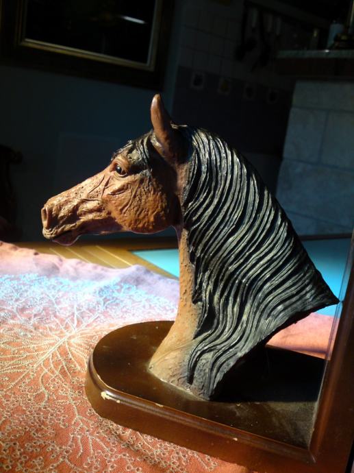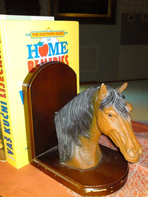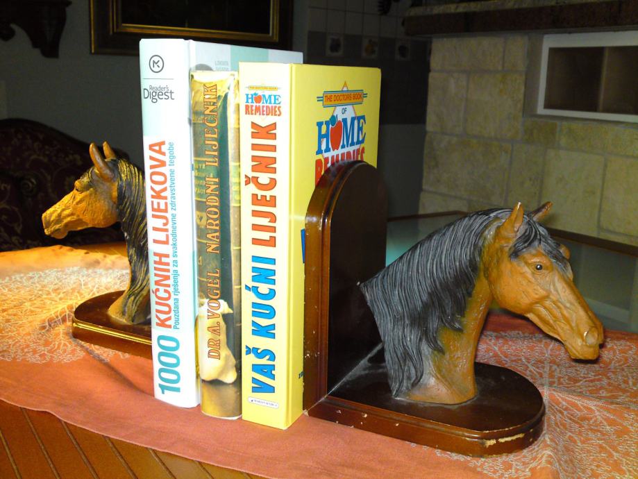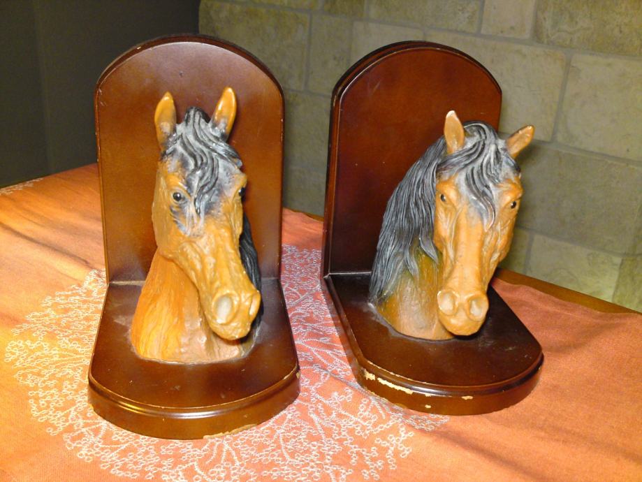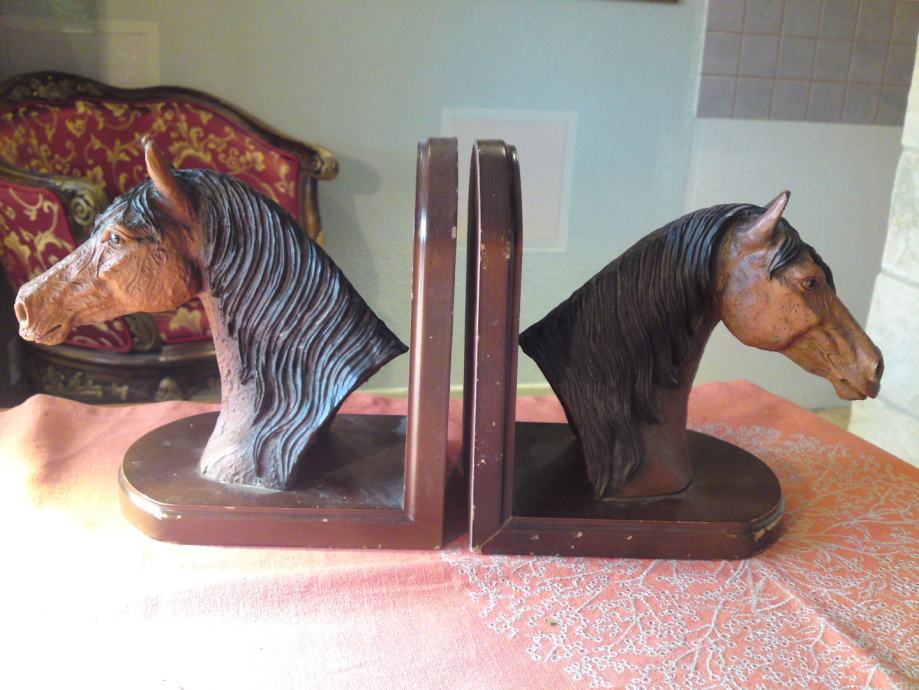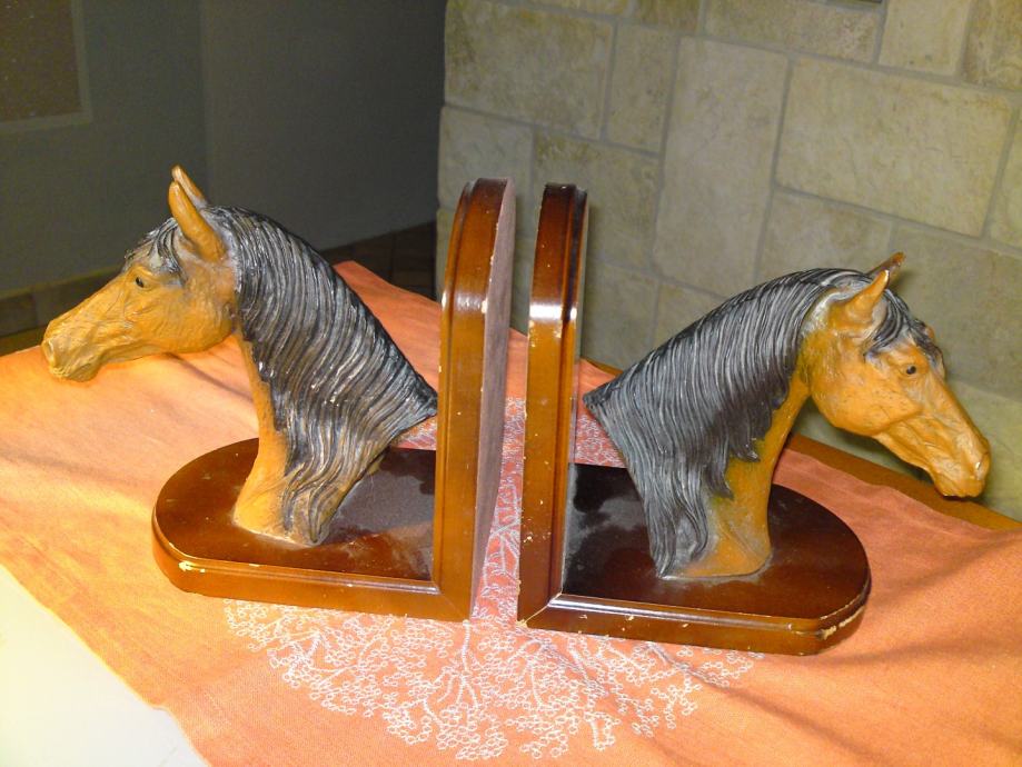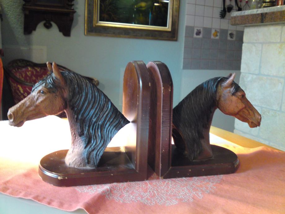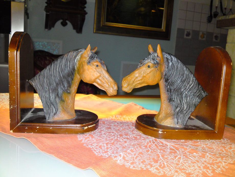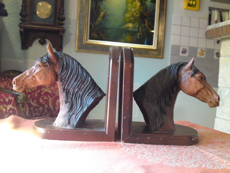 Komplet od 2 komada držača knjiga - konjska glava: materijal: drvo; umjetna koža; dimenzije: širina. 16,0 cm; visina: 18,0 cm; dubina: 12,0 cm; visina konjske glave: 18,0 cm, širina. 18,0 cm.