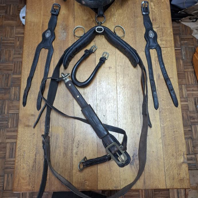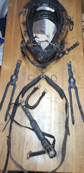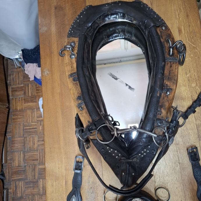 Komplet uključuje drveni jaram s ogledalom, kožne remene i metalne kopče.