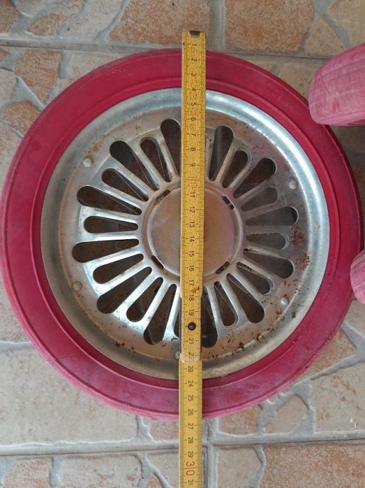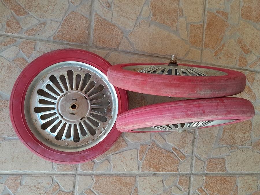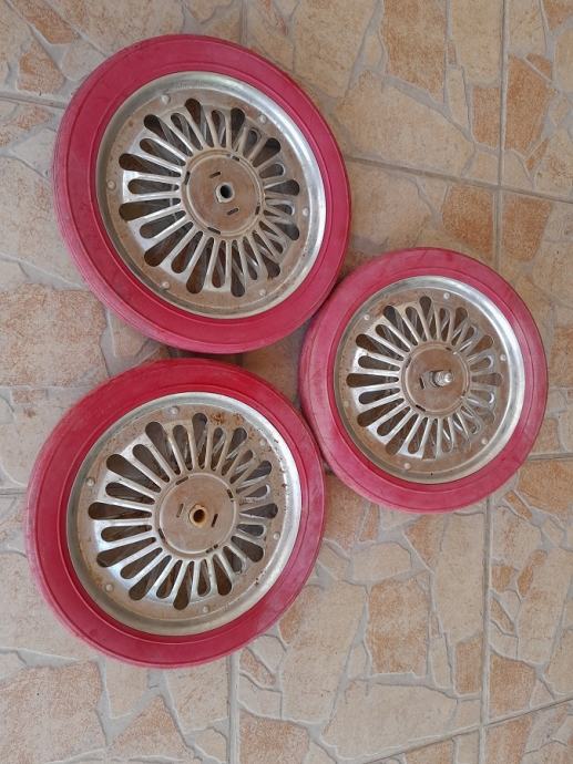 Prodajem kotače za tricikl za djecu iz 60-tih,gume su pune,stanje kao na slici,15 eura za sve,šaljem pouzećem na račun kupca