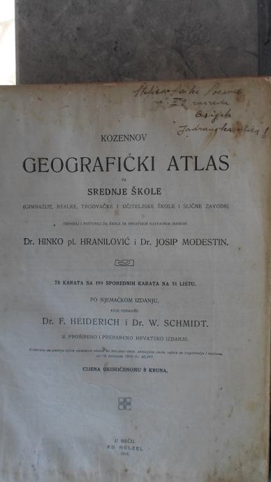Prodajem Kozenov geografički atlas za srednje škole,koji su uredili Dr.Hinko pl.Hranilovoć i Dr. Josip Modestin .Atlas je u vrlo dobrom stanju.