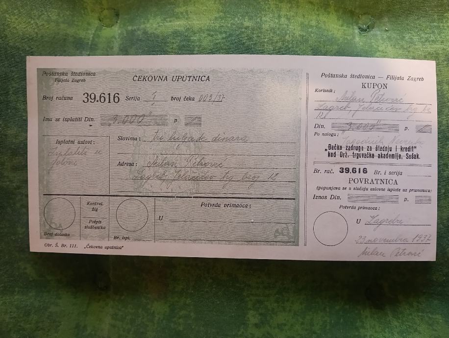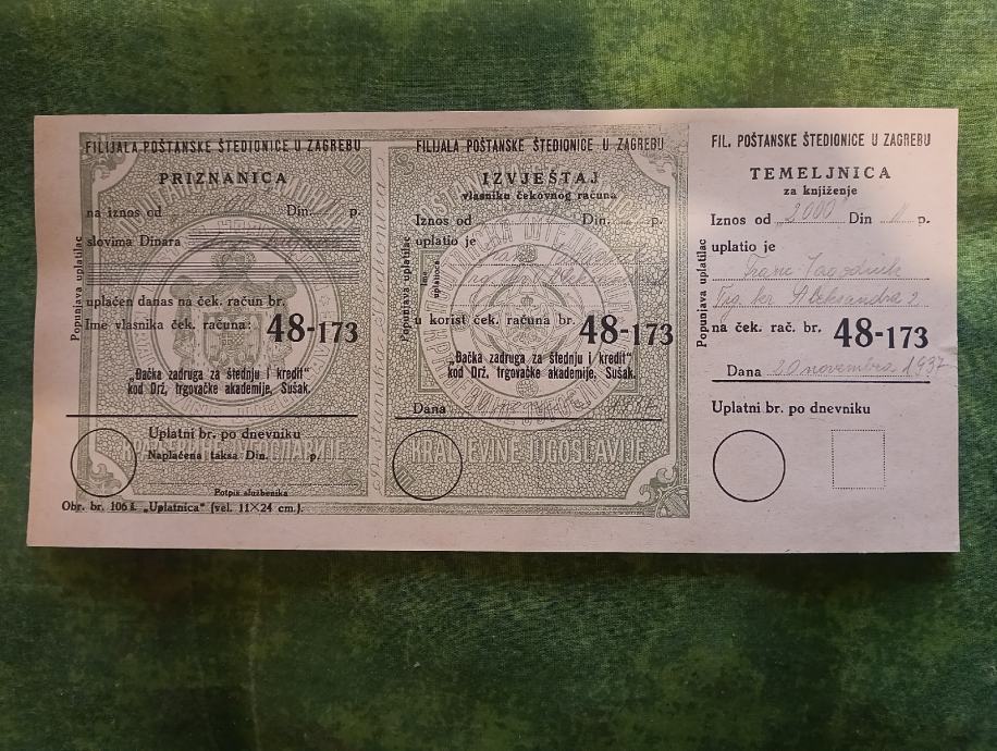 Prodajem lot, čekovnu uputnicu i uplatnicu kraljevine Jugoslavije iz 1937g, đačka zadruga za štednju i kredit kod Drž.trgovačke akademije Sušak, top stanje. Cijena za lot. Plačanje na račun ili gotovina.