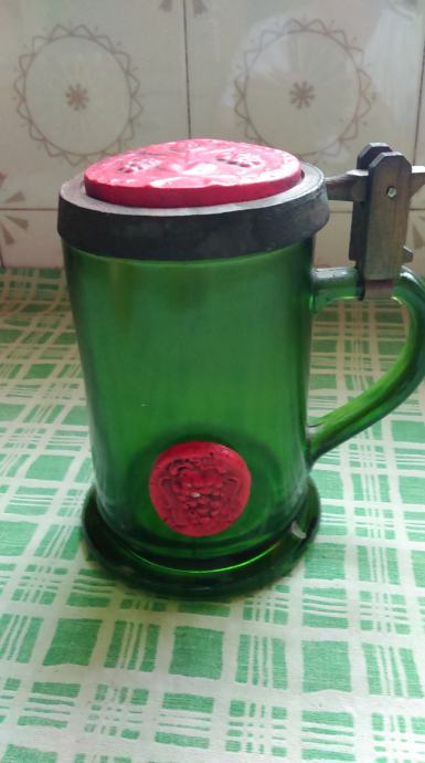 prekrasna unikatna staklena krigla sa drvenim poklopcem i pečatom