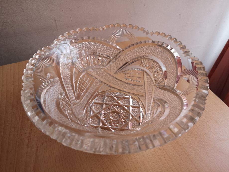 Kristalna zdjela iz circa 50-ih. U urednom stanju bez krhotina ili napuklina. U promjeru 23cm visina 11,5cm