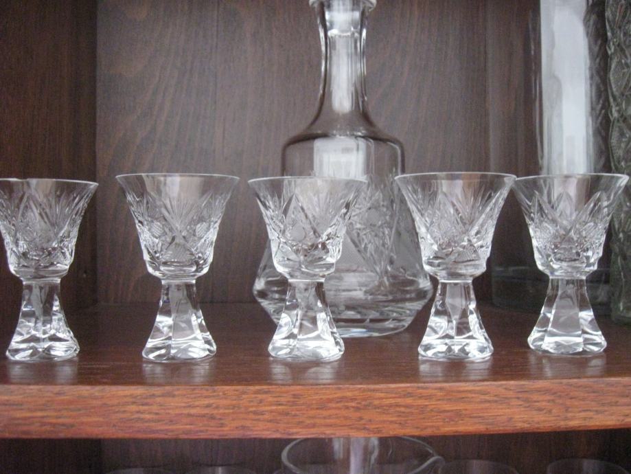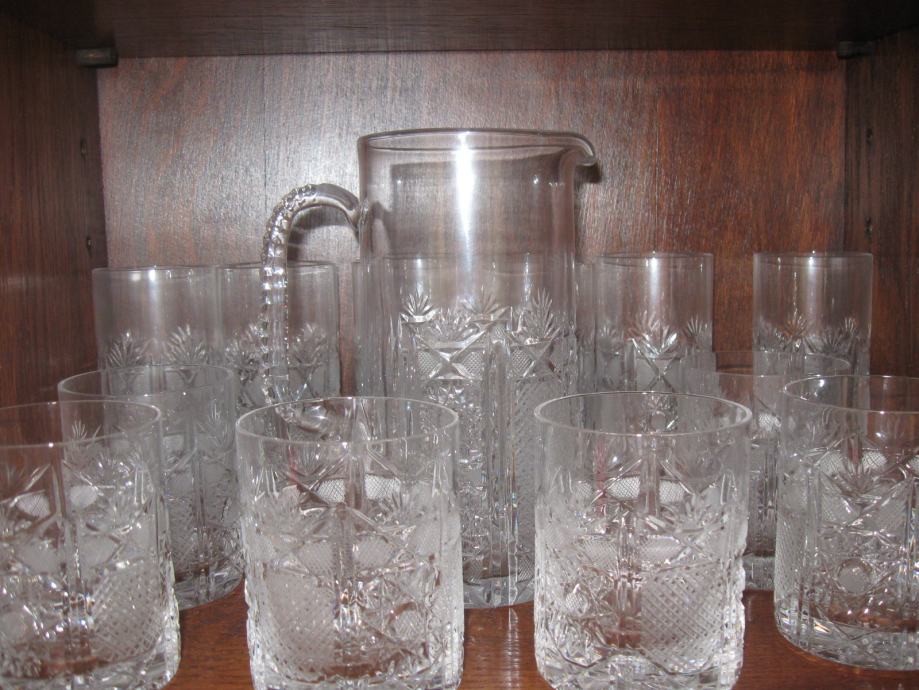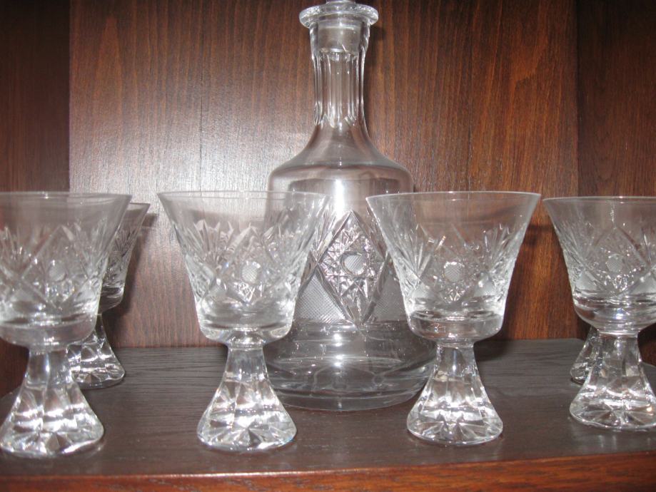stari kristalni servisi za vodu, vino i rakiju, tacne, zdjele kristalne i porculanske u odličnom stanju, bez ikakvih oštečenja. Stajalo u vitrini više od 60 god, nekorišteno.