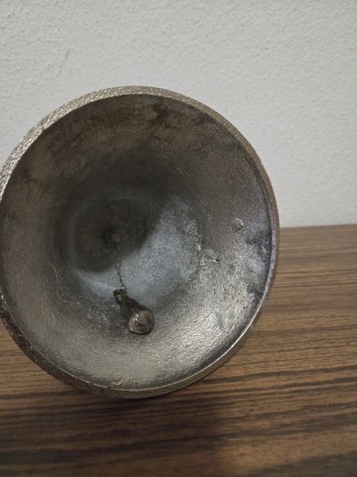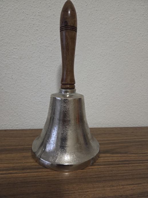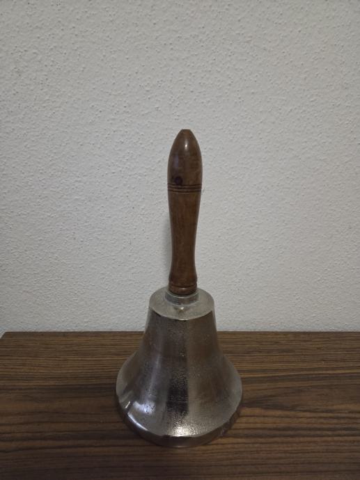 Materijal:krom i drvena drška. Zvono korištenom nekad za oglašavanje odmora u školama. Iz perioda 1970.g. Izuzetno očuvano bez oštećenja. Dostupnost od 25.12