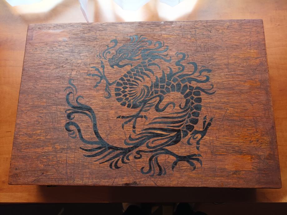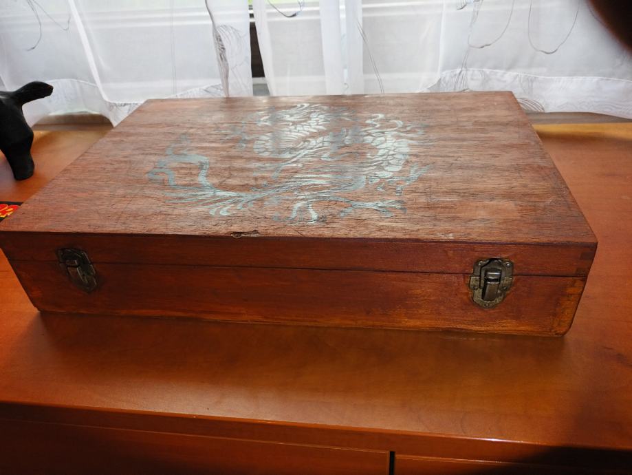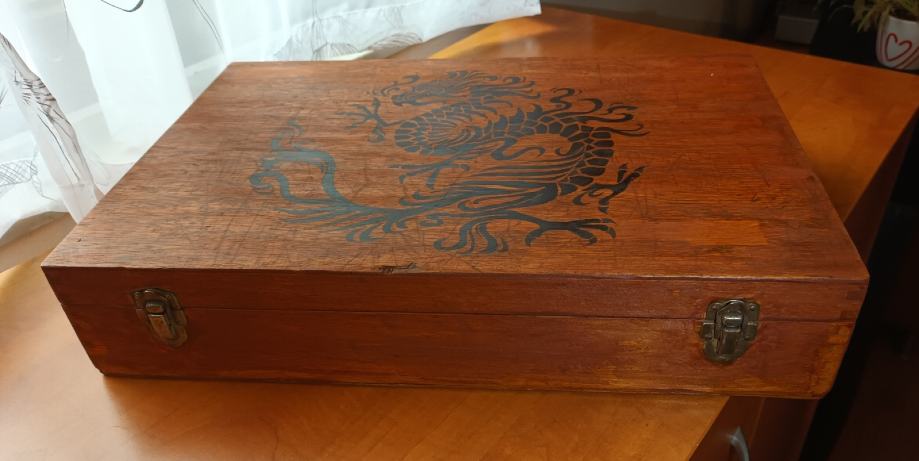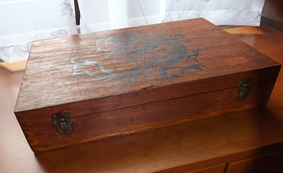 Drvena kutija ,48,5×32,5×9,5 cm.Boja trešnjino drvo.Slika tradicionalni Kineski zmaj.Poštarina po cijeniku Hp ili Tisak.Ne odgovaram za rad dostavnih službi.,Moguće osobno preuzeti ZG