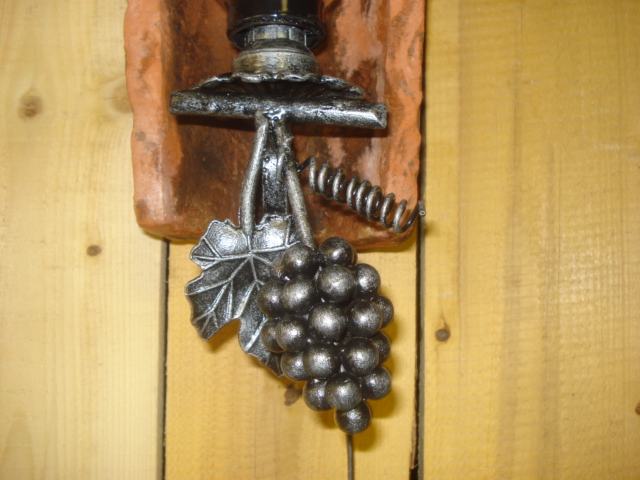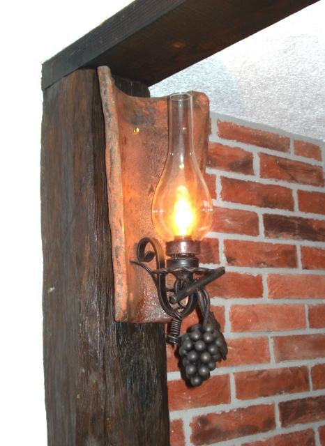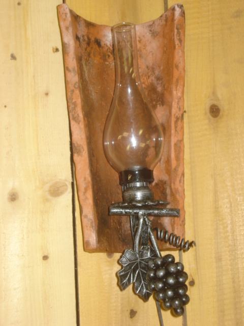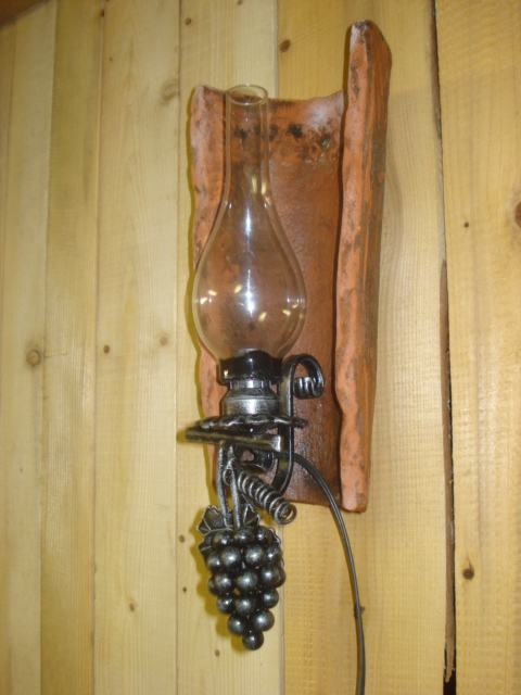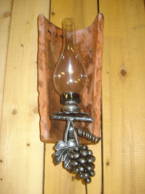 Zidna lampa izrađena od kovanih ukrasa , na podlozi od starog crijepa ili na drvenoj podlozi