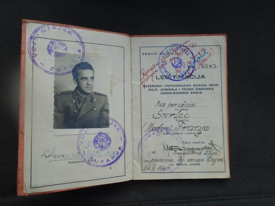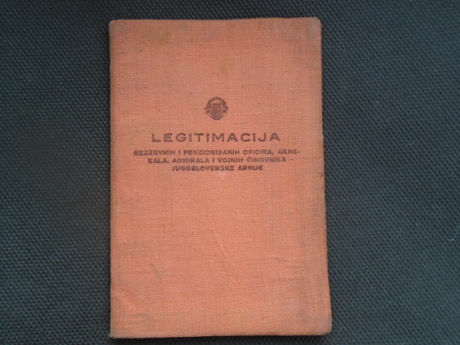 Legetimacija rezervnih i penzionisanih oficira,generala,admirala i vojnih činovnika Jugoslavenske armije.Pripadala narodnom heroju Franji Škrlec kasnije visokom dužnosniku i zastupniku u Saboru SRH