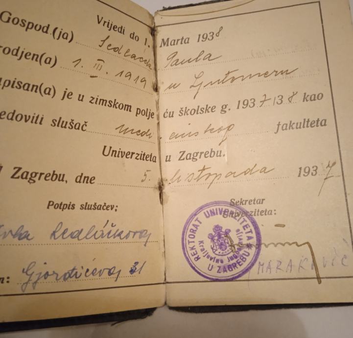 Legitimacija redovnog slušača Medicinskog fakulteta Zagreb, izdana 1937.g.