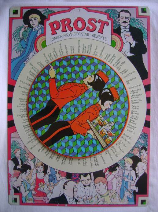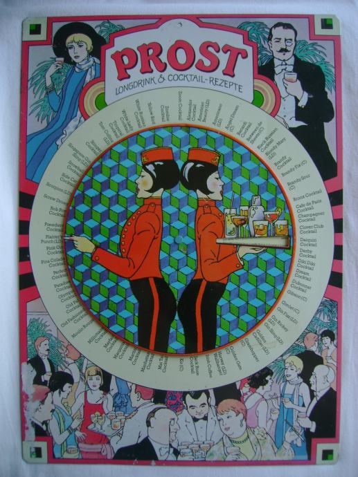 Prost; Longdrink & Cocktail Rezepten - metalna ploča sa receptima za koktele, na njemačkom jeziku, cca 29 x 41 cm, vrlo dobro očuvano - stanje je vidljivo na slikama.