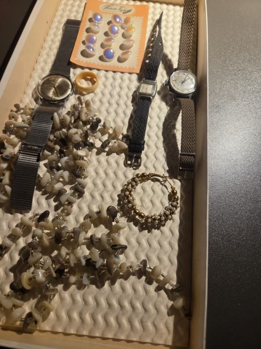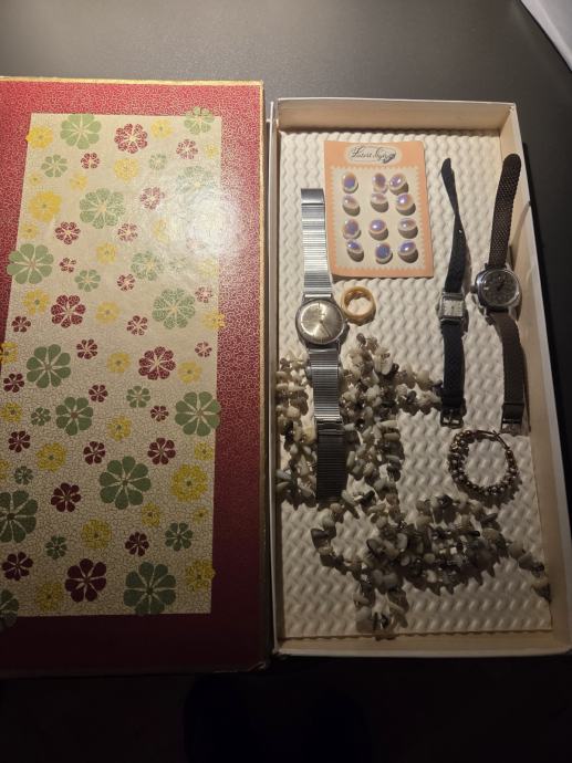 Originalna vintage kutija od Kraša, pronađena na bakinom tavanu. U kutiji se nalaze 3 antikna ženska sata, prsten, 1 naušnica, stari gumbi i ogrlica od kamenčića.