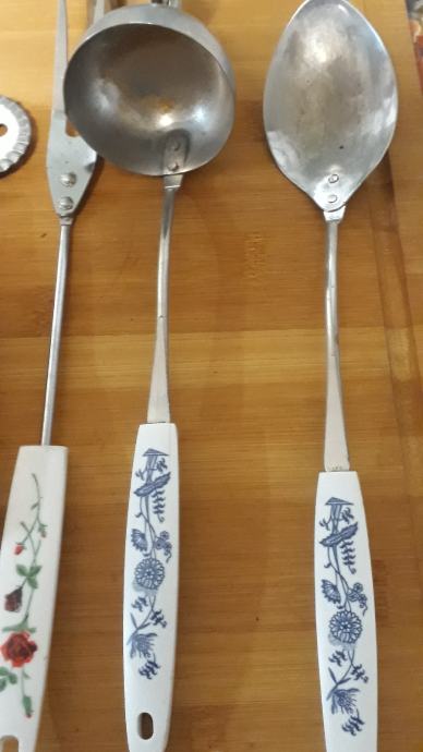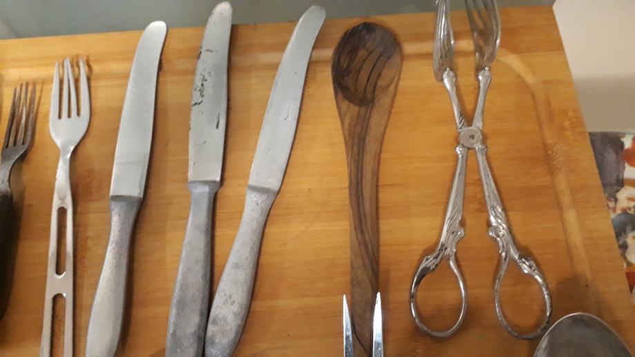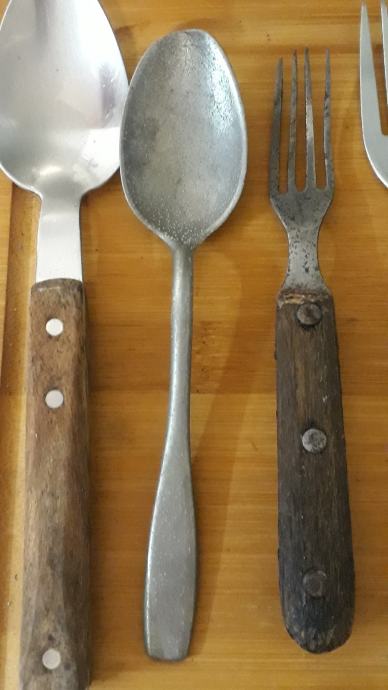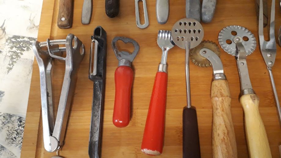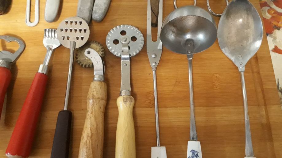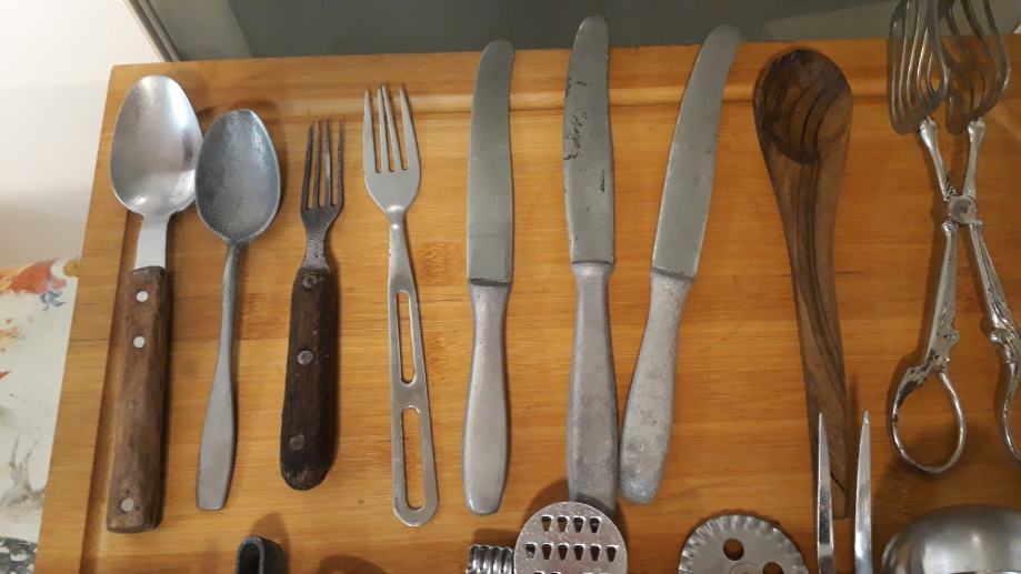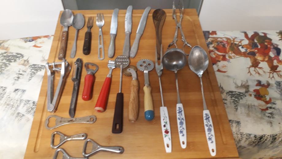 Lot 30 komada starog pribora za jelo i ostalih kuhinjskih alata.stanje vidljivo.šaljem posta ili tisak.0958241802