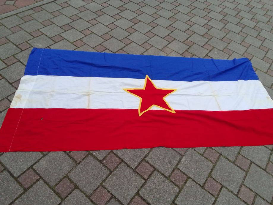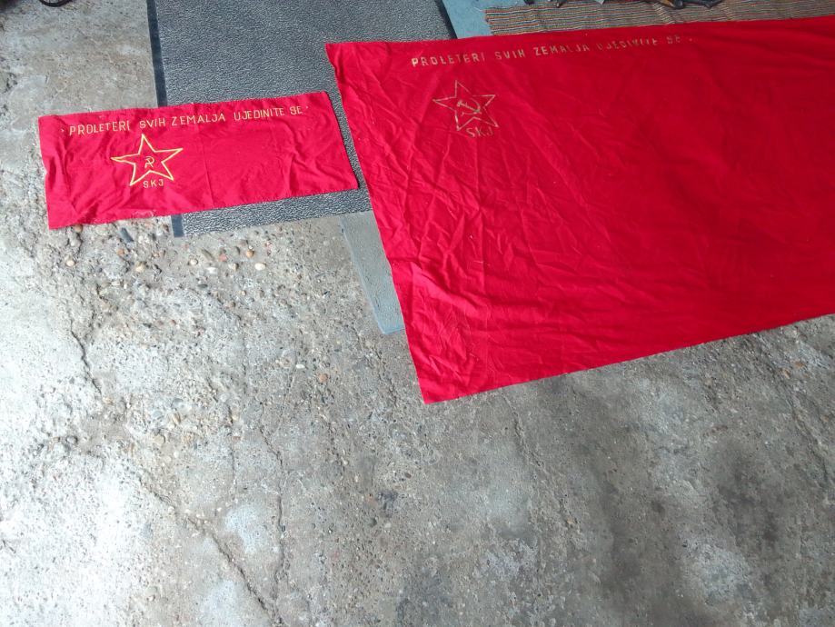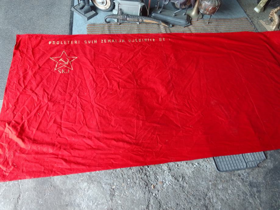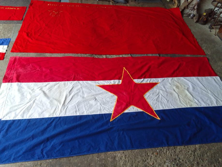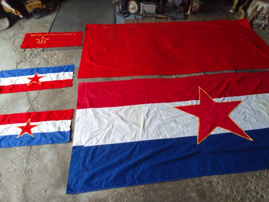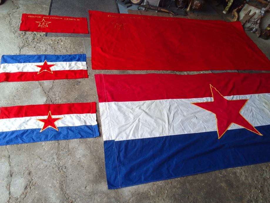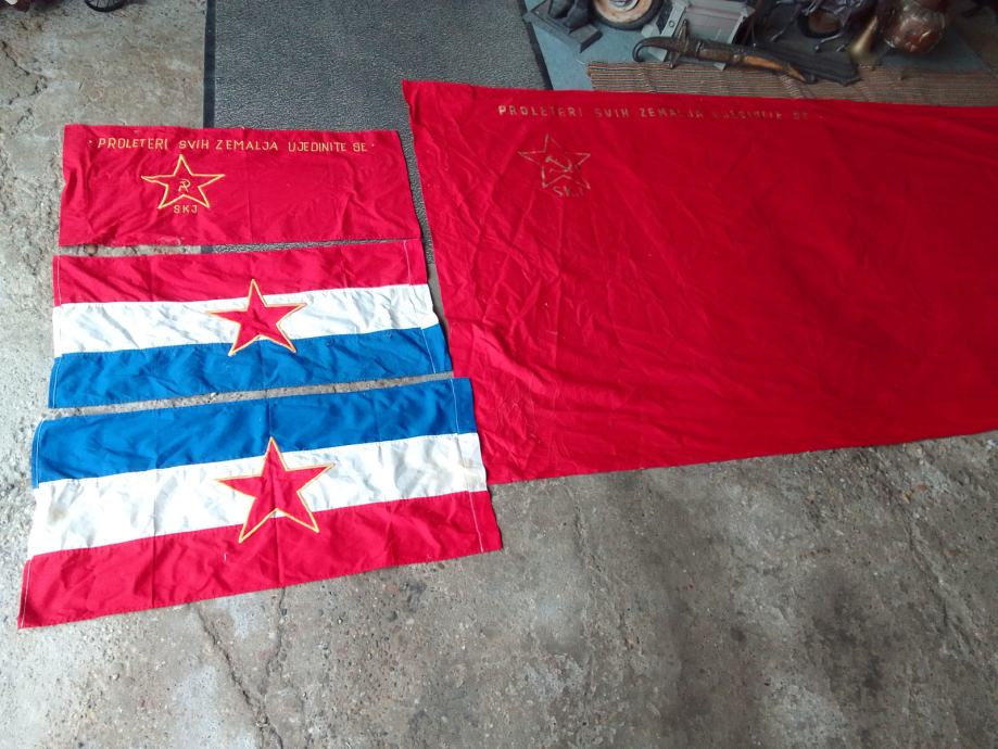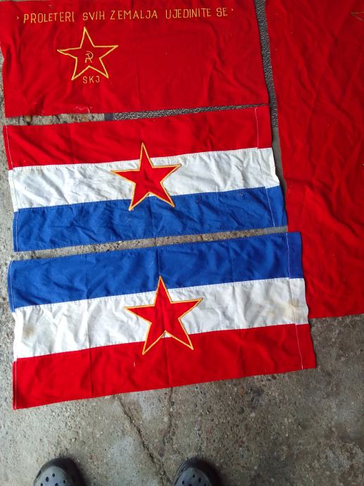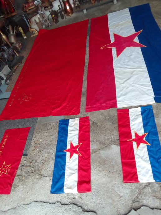 Sve su original iz iz bivše Juge,materijal platno,imam ovih 5 kom koje su raznih dimenzija..velika zastava SRH je 240 x 115cm,,velika jednobojna zastava proleteri je isto 240 x115cm,,tri manje zastave-- jednobojna proleteri je 72 x 34cm,zastava SRH je 72 x 34cm,,i zastava SFRJ je 72 x 34cm..navedena cijena je za cijeli lot o uvid u zamjene..usput pogledajte moje ostale oglase starina i antikviteta....nazovite da dogovorimo vrijednost u zamjenama...........manja zastava na prvoj slici dolje u sredini je riješena