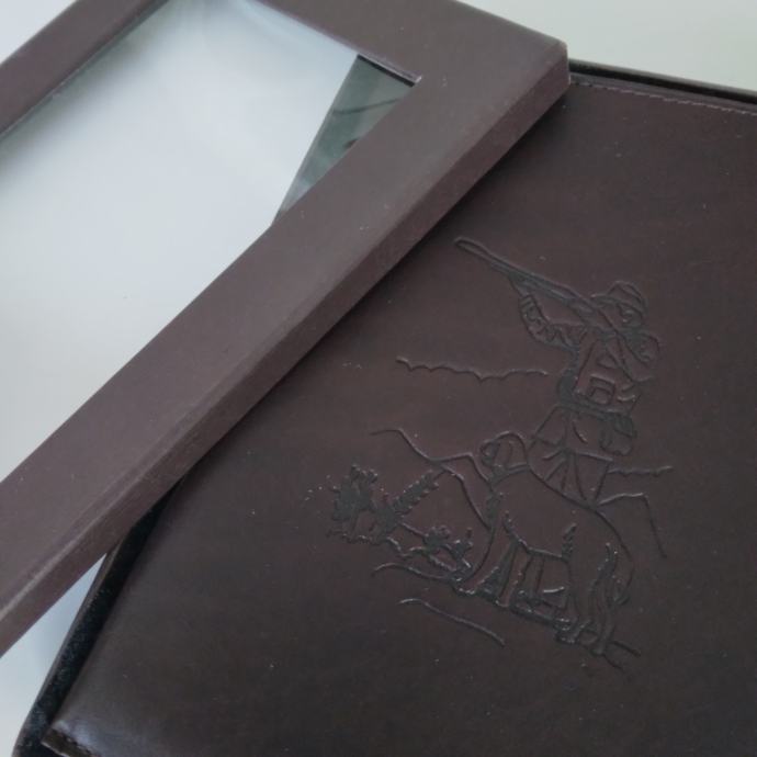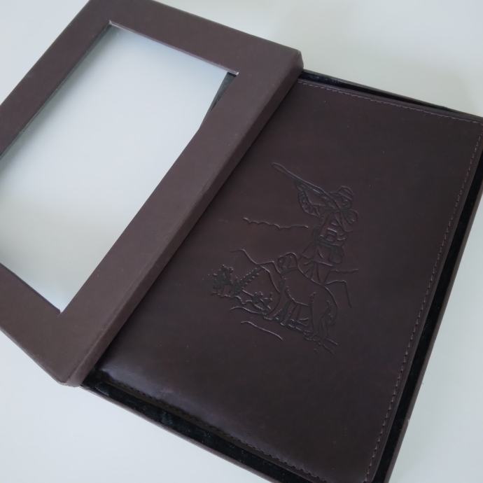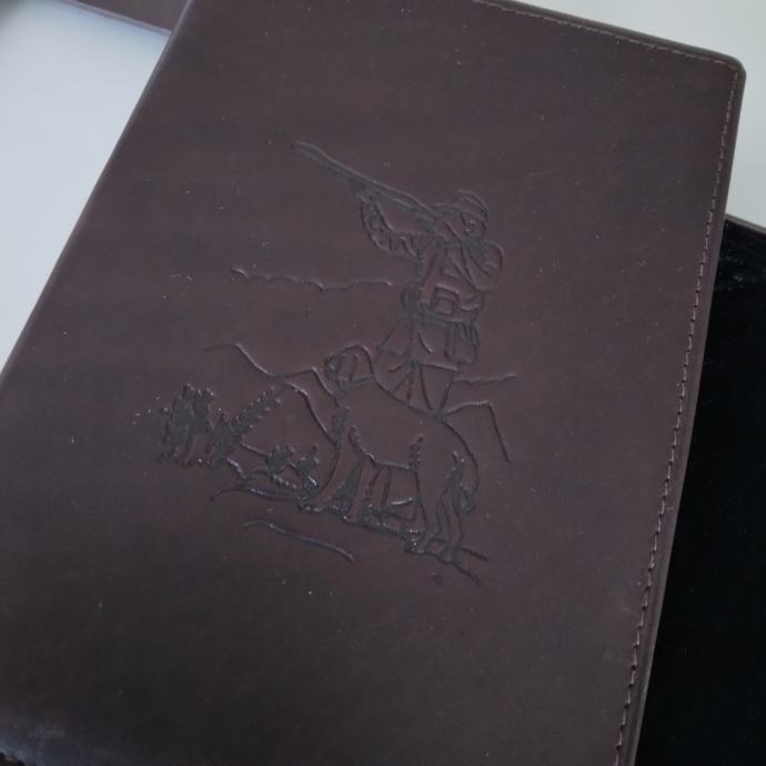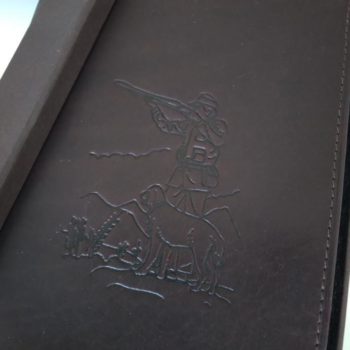 Novčanik od kože unutarnji dio novčanika obložen mekanom tkaninom. Ne korišteni novčanik. Sa prednje strane nalazi se utisnut motiv: lovac, pas i šuma.