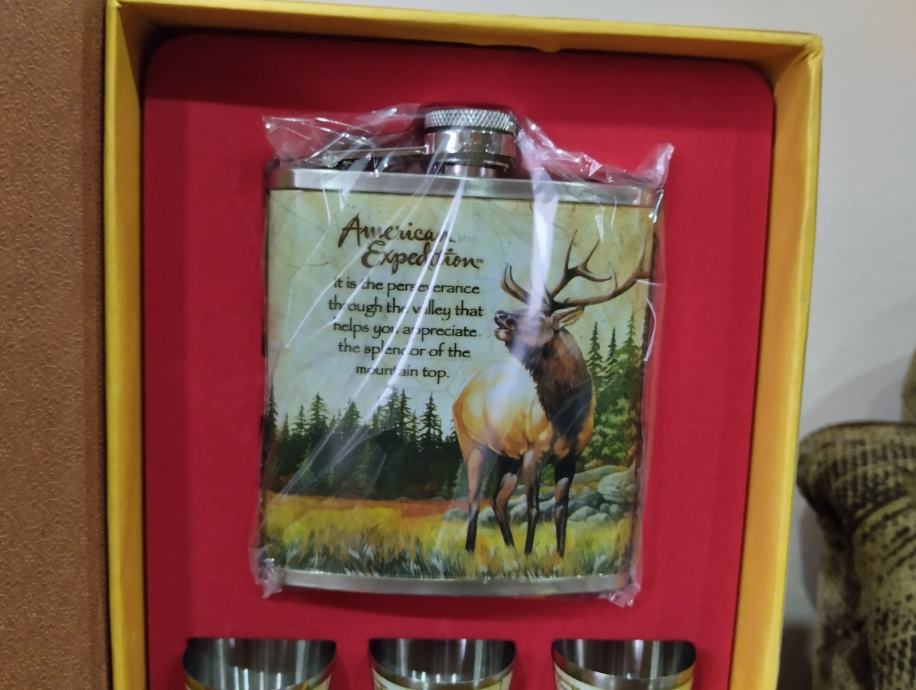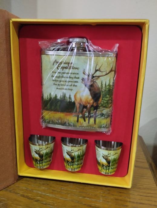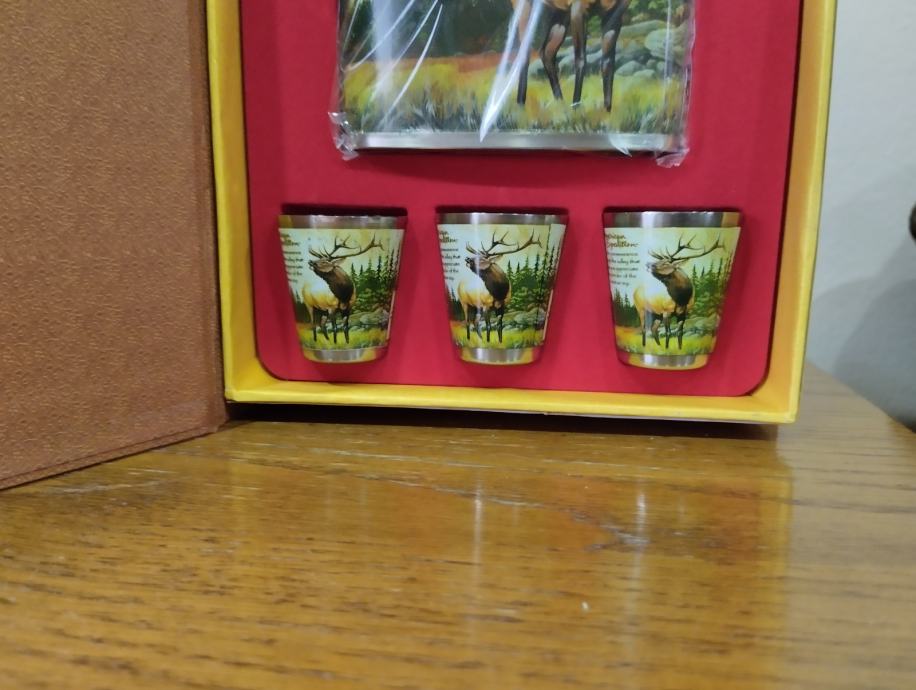 lovački set jelen nije korišten, zapremina pljoske 2 dcl, izrađen od nehrđajućeg čelika, kvalitetna grafika, zatori se kao knjiga