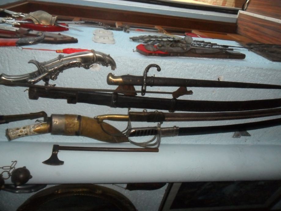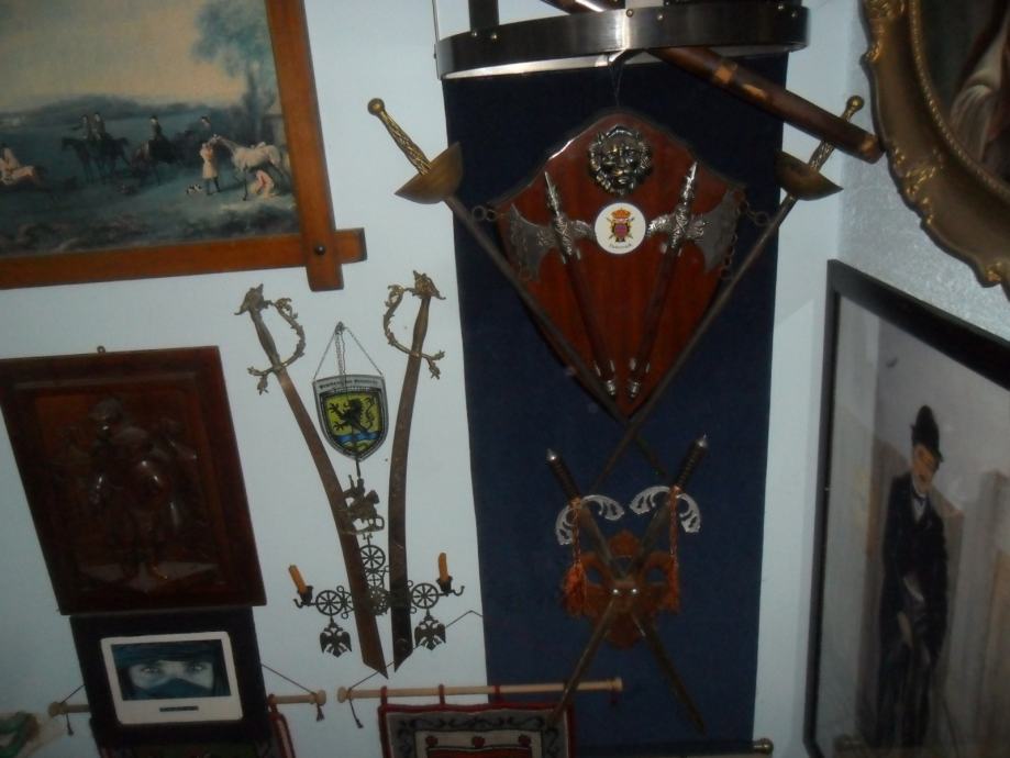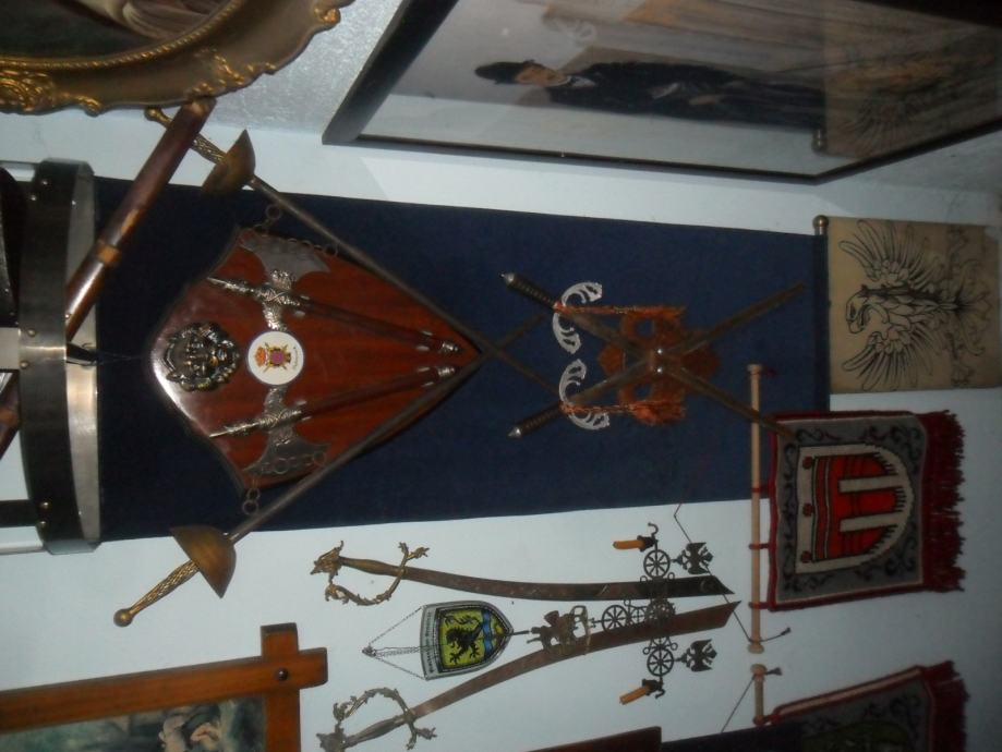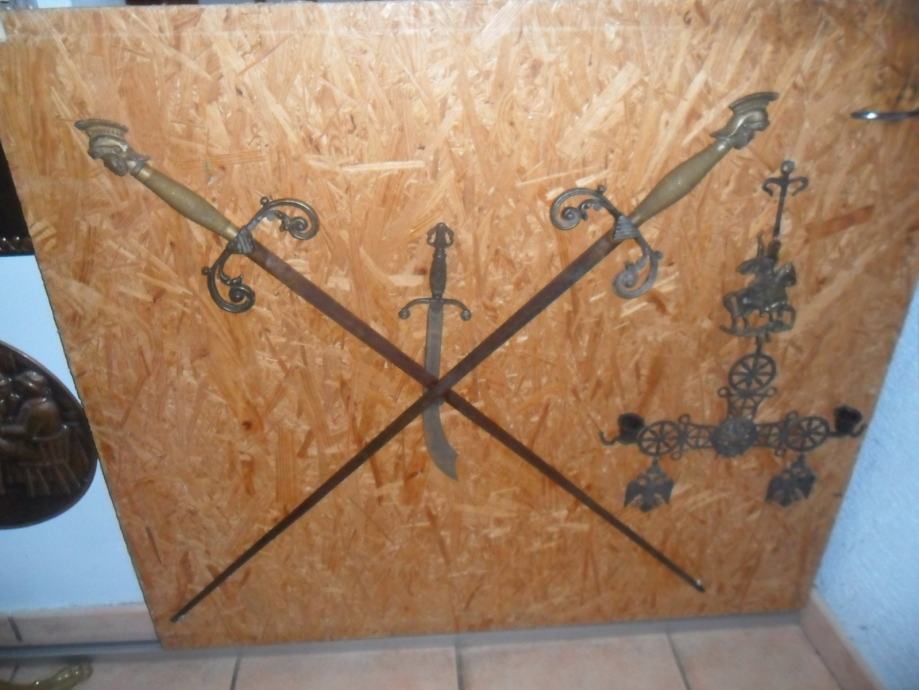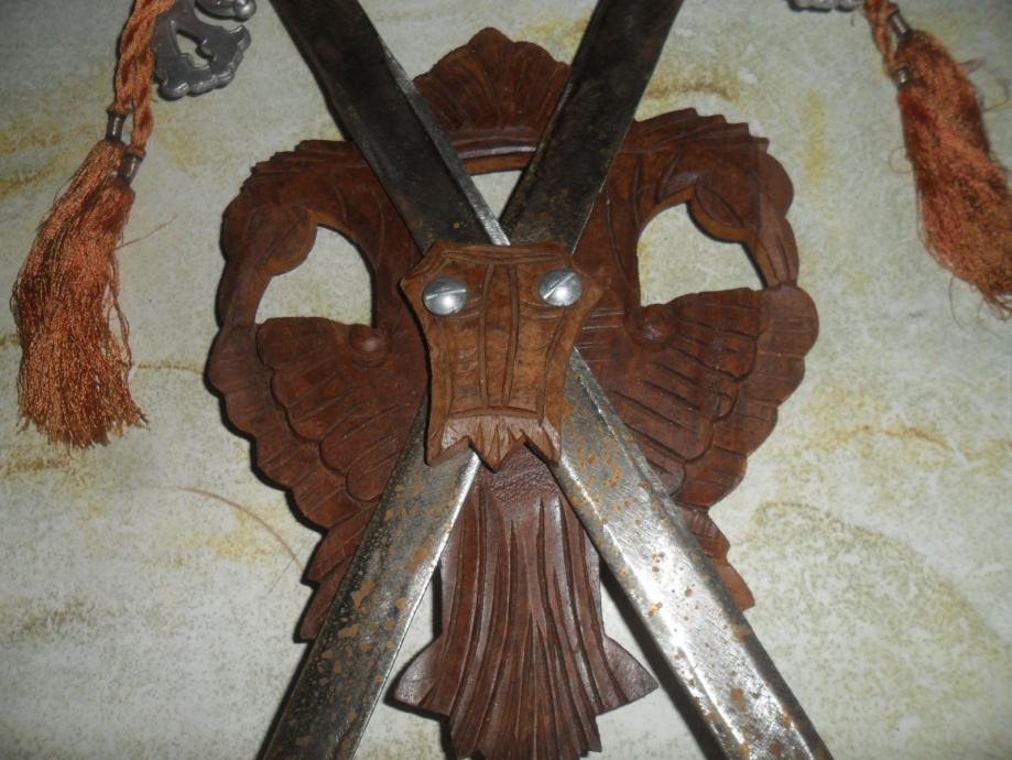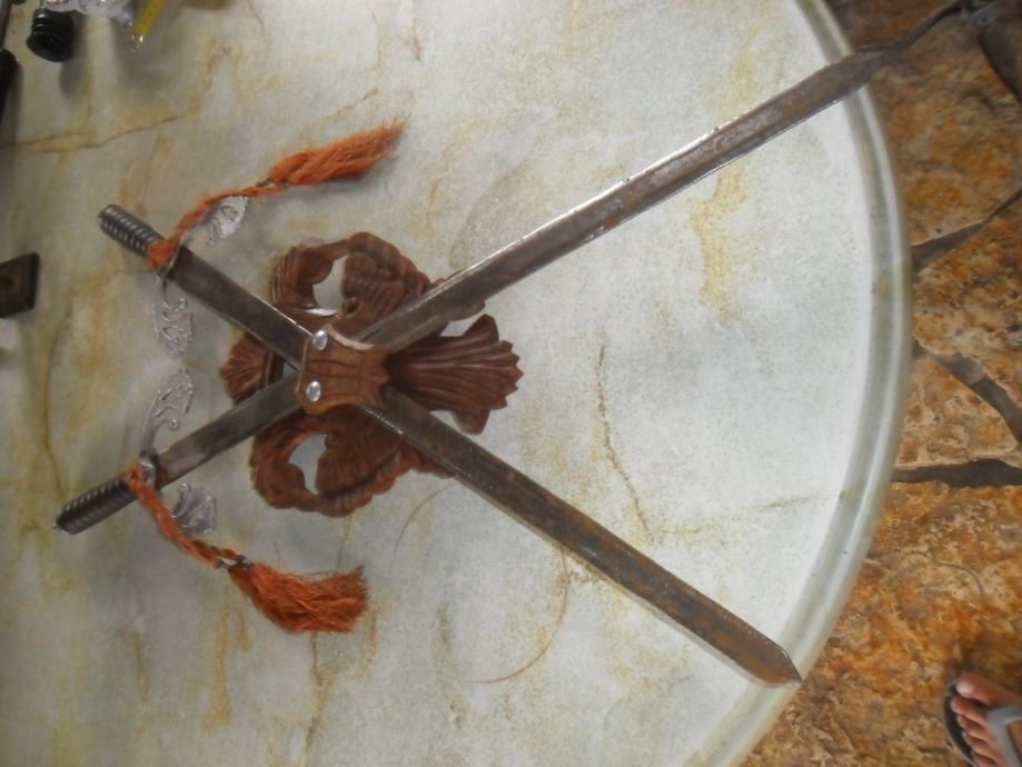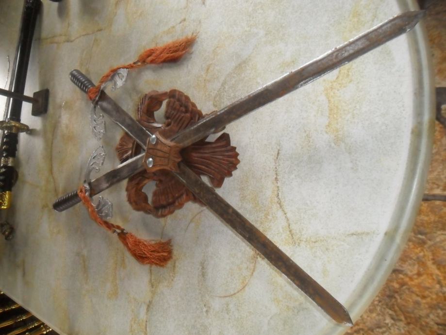 mačevi su kompletno metalni osim drške,štitnici za ruku i sječivo su metalni,,postolje u sredini je drveno,lijepa dekoracija za zid, ukupna visina je 70 cm,a širina je 35cm...imam još dosta sličnih ali manjih ukrštenih mačeva na podlogama,i solo mačeva i sablji koje možete vidjeti u mojim ostalim oglasima