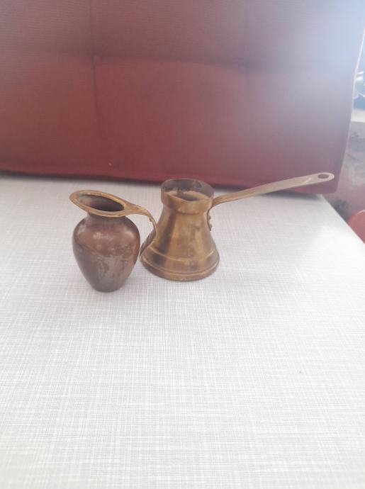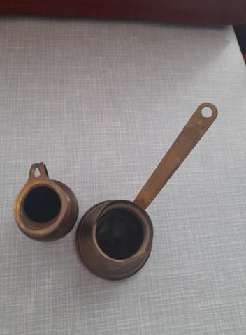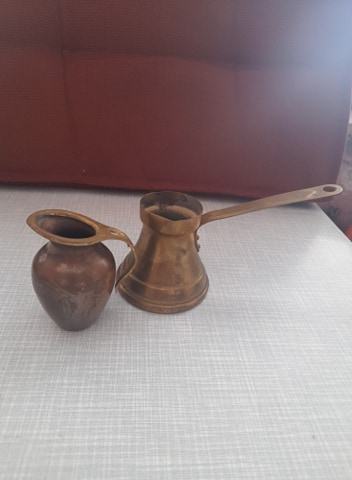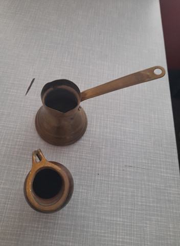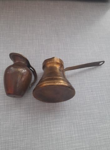 od bronce, dužina đezve 6,3 cm, gornji krug 4 cm, drška 9 cm i donji krug 6,5 cm, visina ibrika 7 cm, širina 5 cm, širina gornjeg kruga 3 cm, dno 2,5 cm, vidi slike