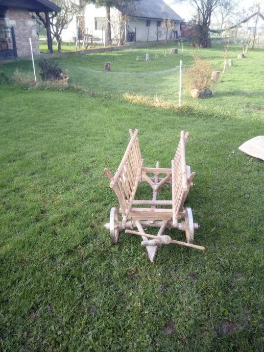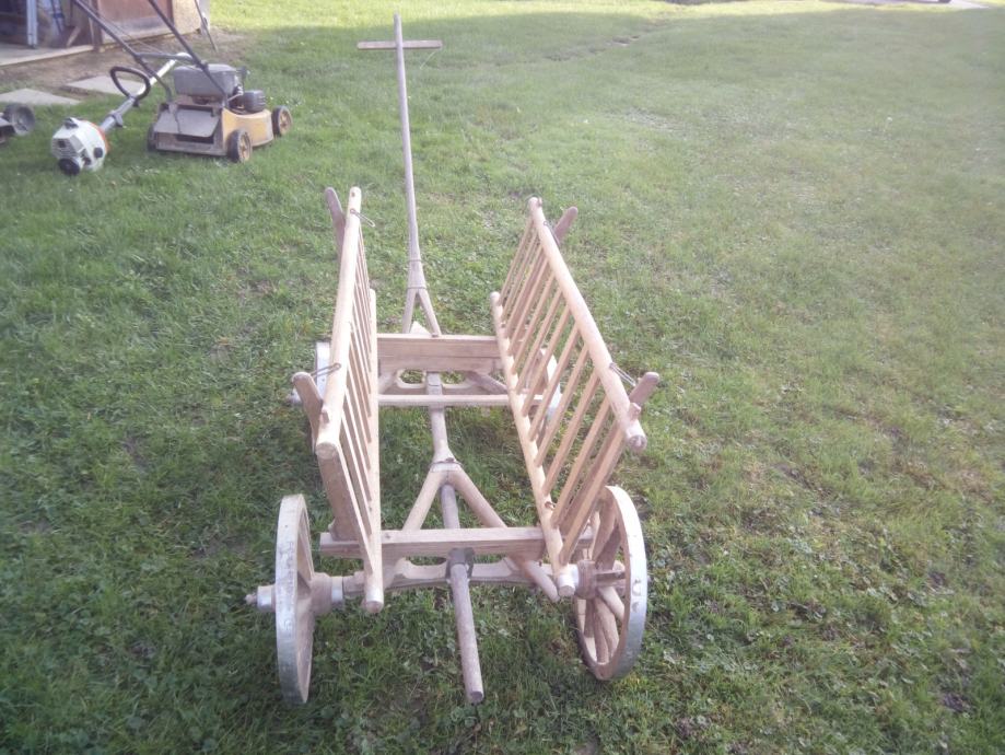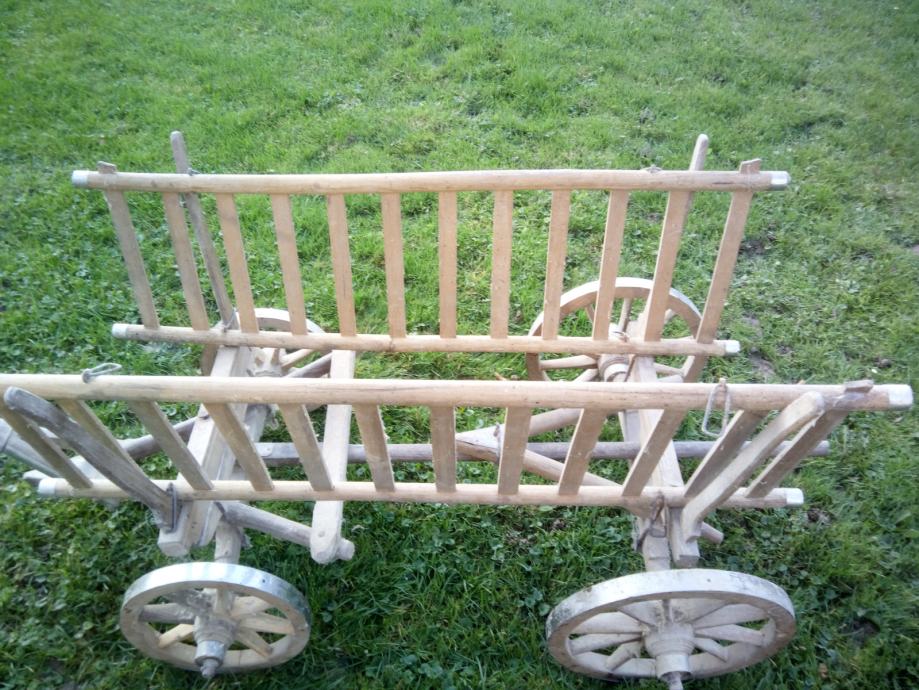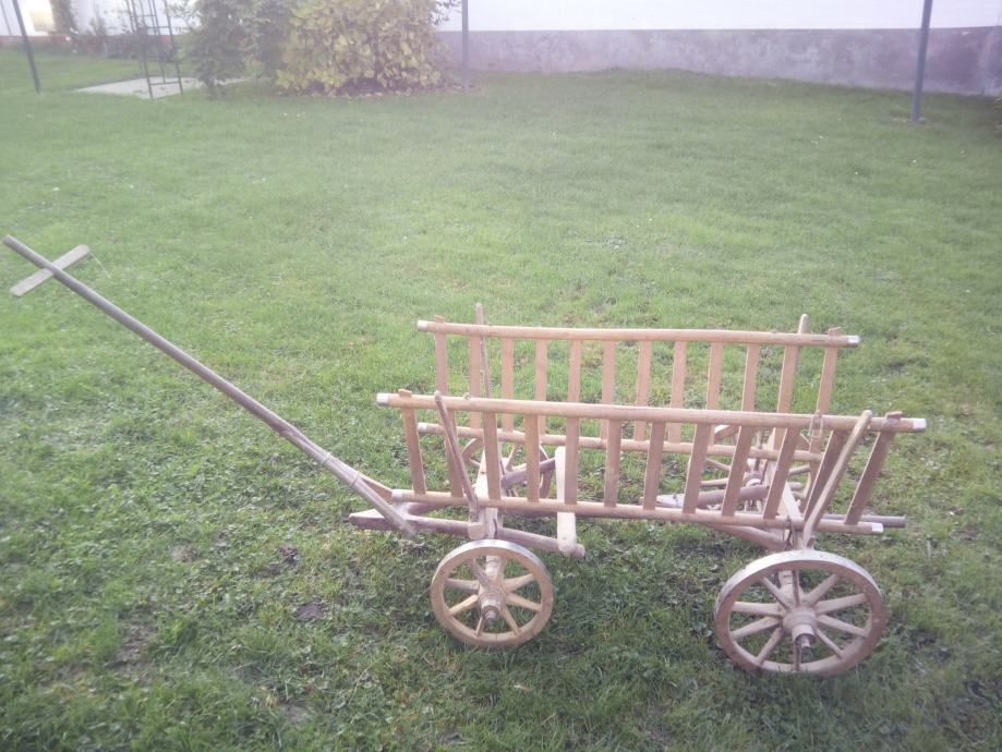 Mala drvena kola, nekorištena, stara više od 60 godina, ručno izrađena. Duljina 140 cm bez rude, visina 70 cm, kotači zadnji promjera 40 cm, prednji 30 cm. Zvati na broj 099 791 5782.