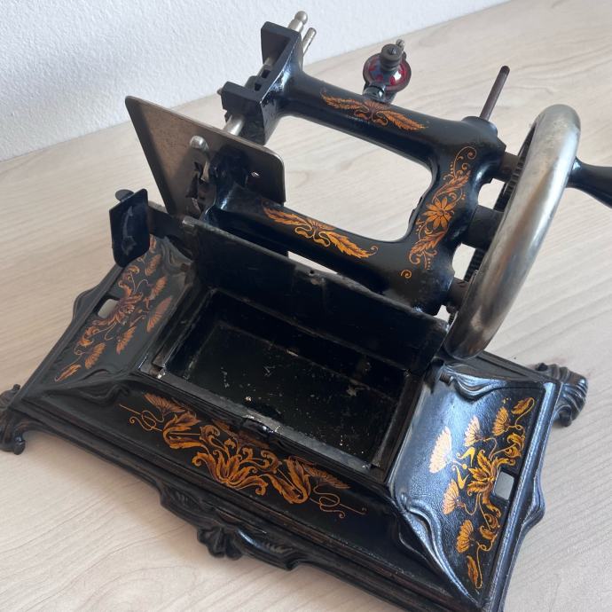 Prastara mašinica za šivanje, proizvodac nepoznat, ali piše Germany. Svi zupčanici se još okreću i igla ide gore dolje. Teška oko 2,5 kg, metal. Otvara se, unutra je mali pretinac za konce i druga blaga. Dimenzije 29x23x16 cm