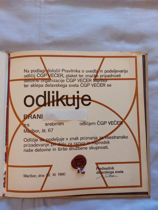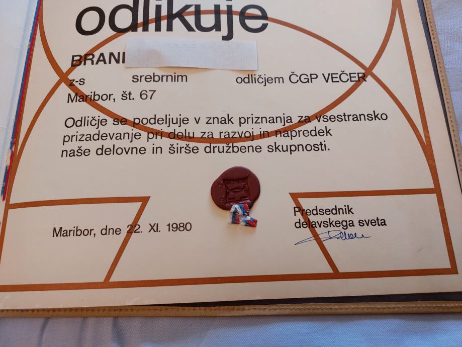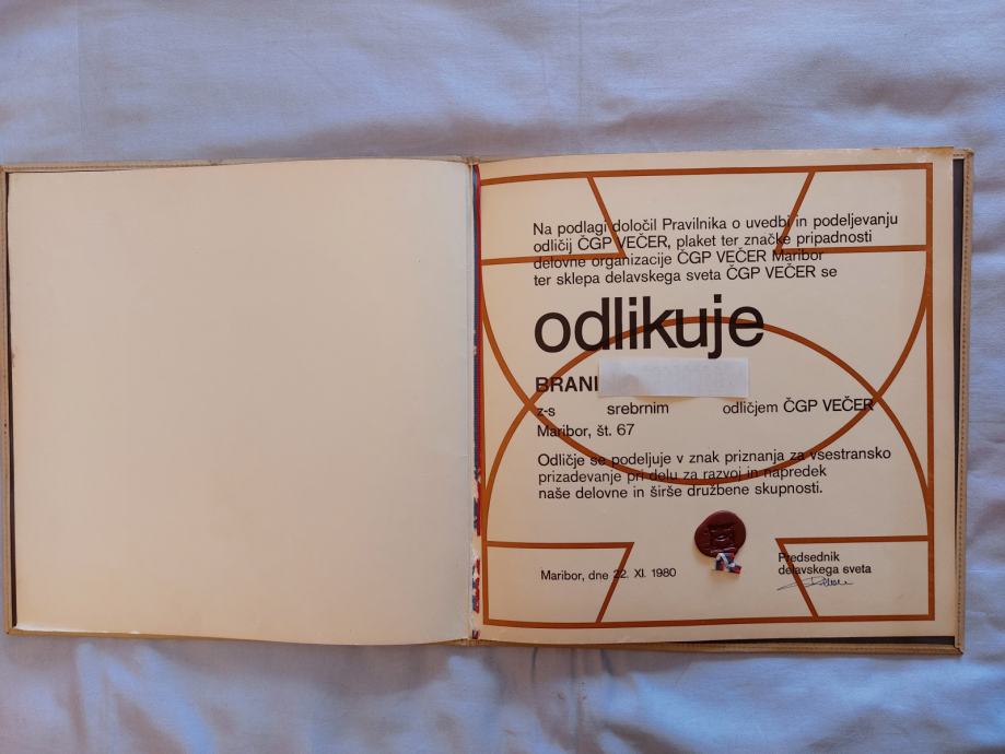Mapa o dodjeli priznanja navedenog Mariborskog tiska.