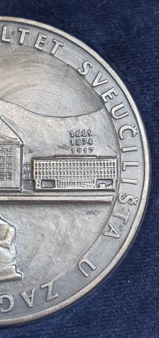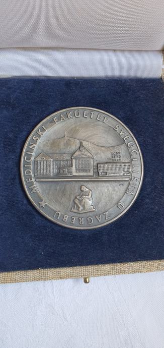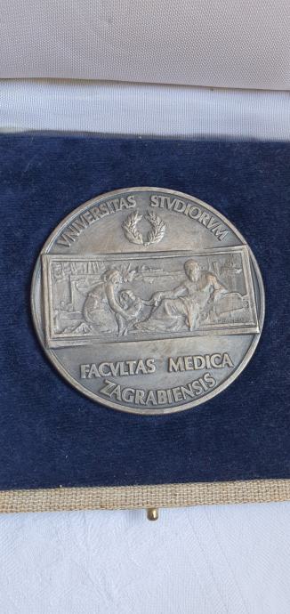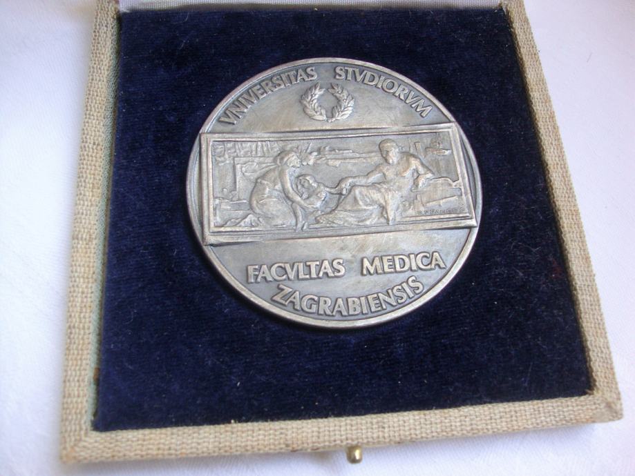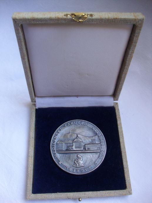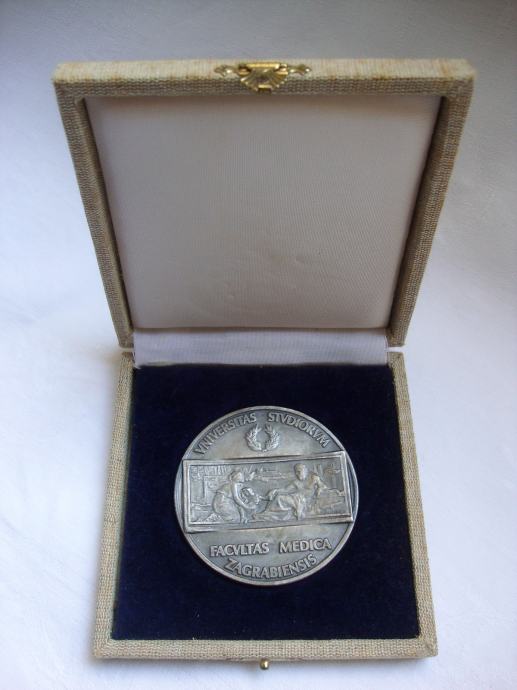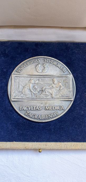 Krasna medalja u originalnoj kutiji motiv Medicinski fakultet Zagreb s druge strane motiv Alegorijski prikaz medicine ,rad Roberta Frangeša Mihanovića, rad medalja ra Damir Mataušić 1981. promjer medalje je 6,5 cm stanje perfektno