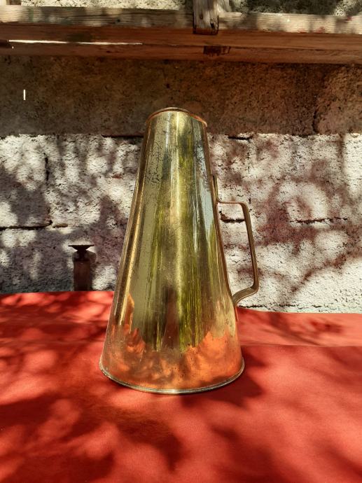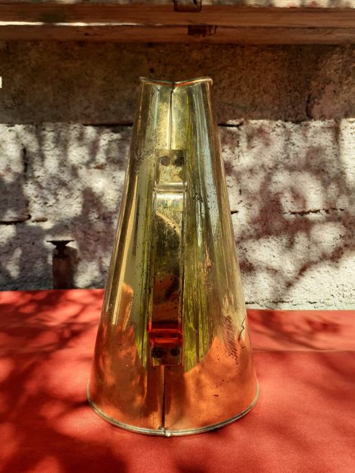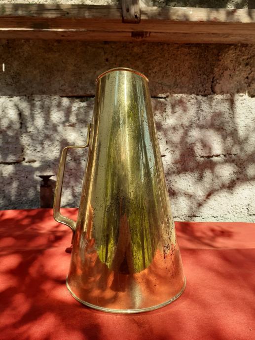 Prodaje se mesingani megafon. Ima manja površinska oštećenja u vidu korozije i struganja. Dužine je 31 cm. Ima natpis na njemačkom jeziku. Cijena megafona je 40 eura. Mogućnost osobnog preuzimanja u Zadru. Kontakt broj mobitela 091 131 10 36.