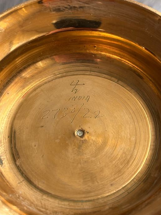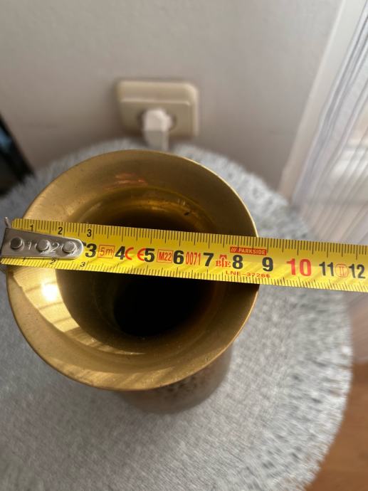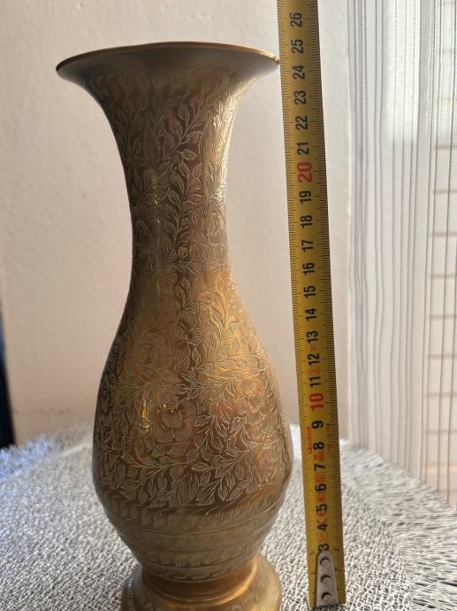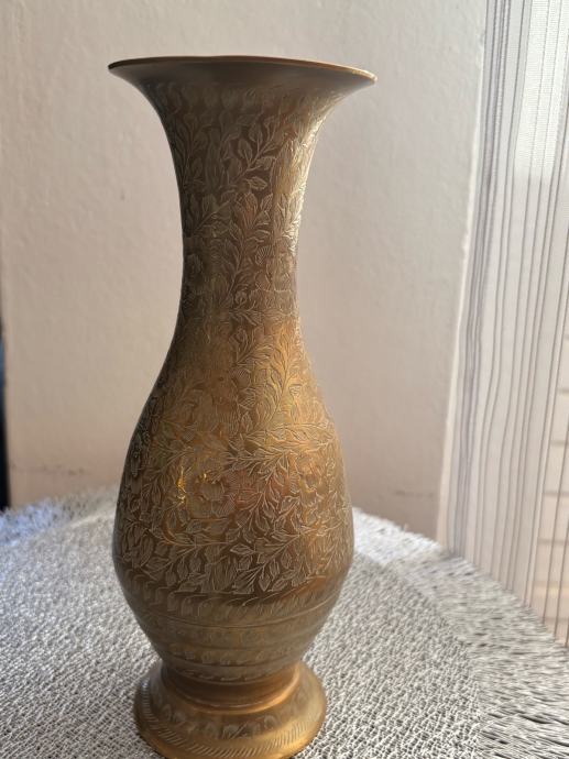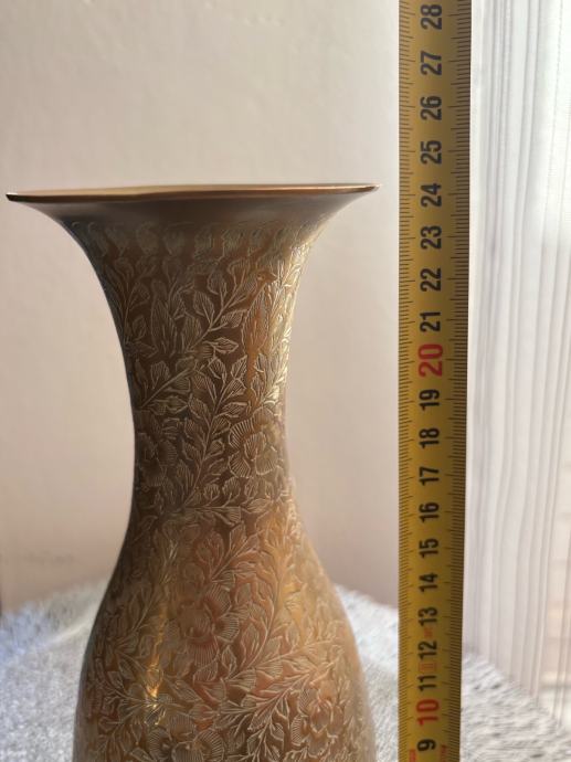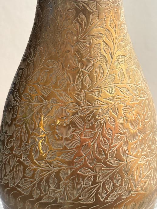 Elegantna i dekorativna vaza izrađena od kvalitetnog mesinga (mjedi), bogato ukrašena reljefnim floralnim motivima ruže. Detaljna izrada i istaknuti ornamenti daju joj poseban vintage i umjetnički karakter. Dodatnu vrijednost predstavlja potpis.