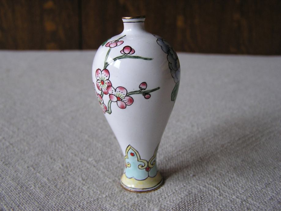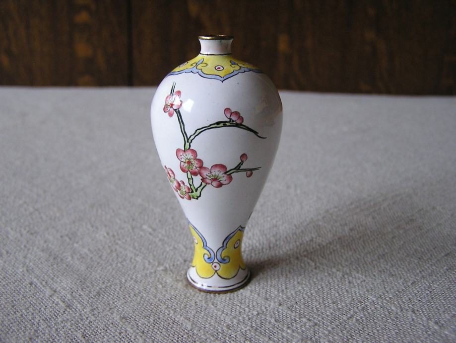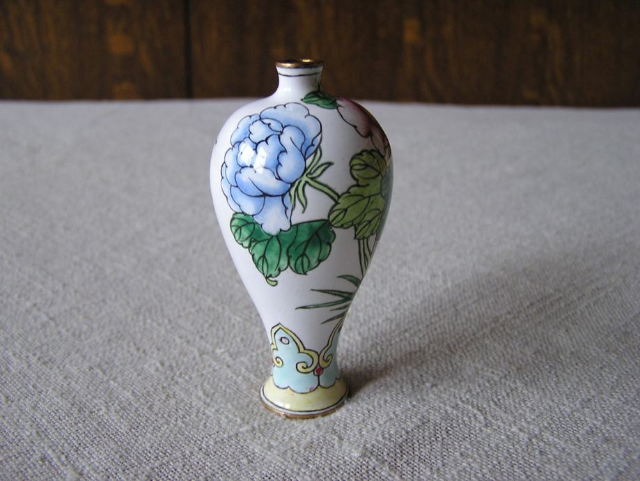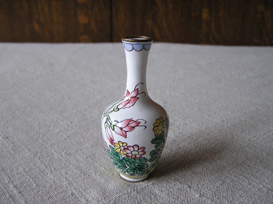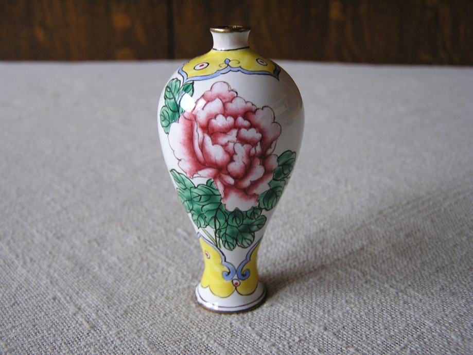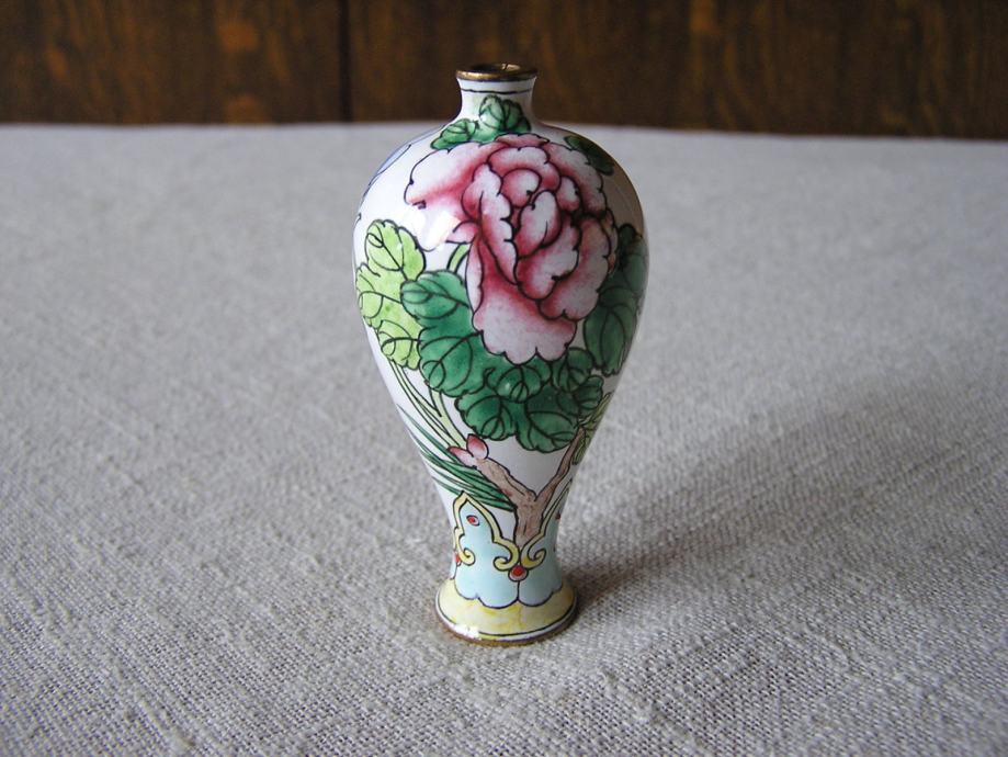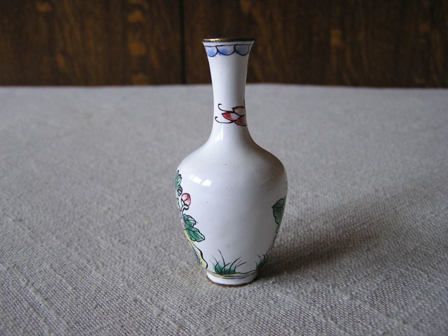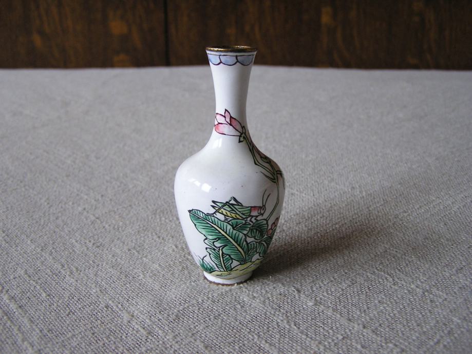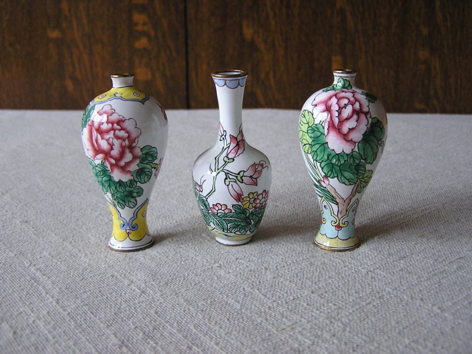 Tri male mesingane vazice rukom ukrašene cvjetnim uzorkom na bijelom emajlu. Kineske ili Japanske iz 1970ih. U odličnom su stanju, sitne točkice su mrljice od boje nastale kod ukrašavanja. Male ali vrlo efektne, kolekcionarski primjerci, a uz to i unikatne jer kod ručnog bojanja i ukrašavanje ne postoje 2 potpuno ista predmeta.