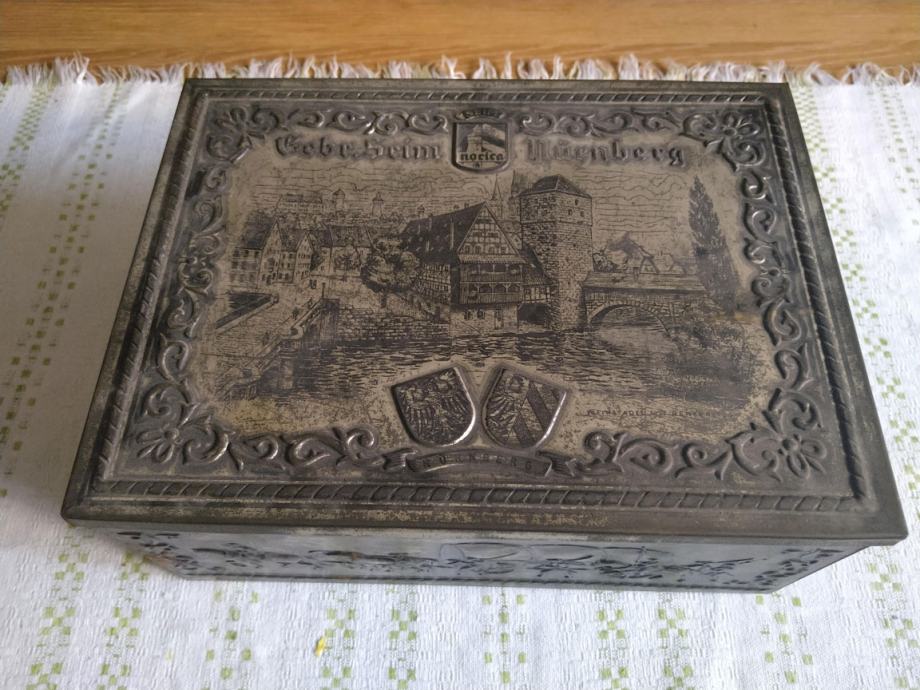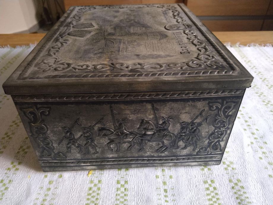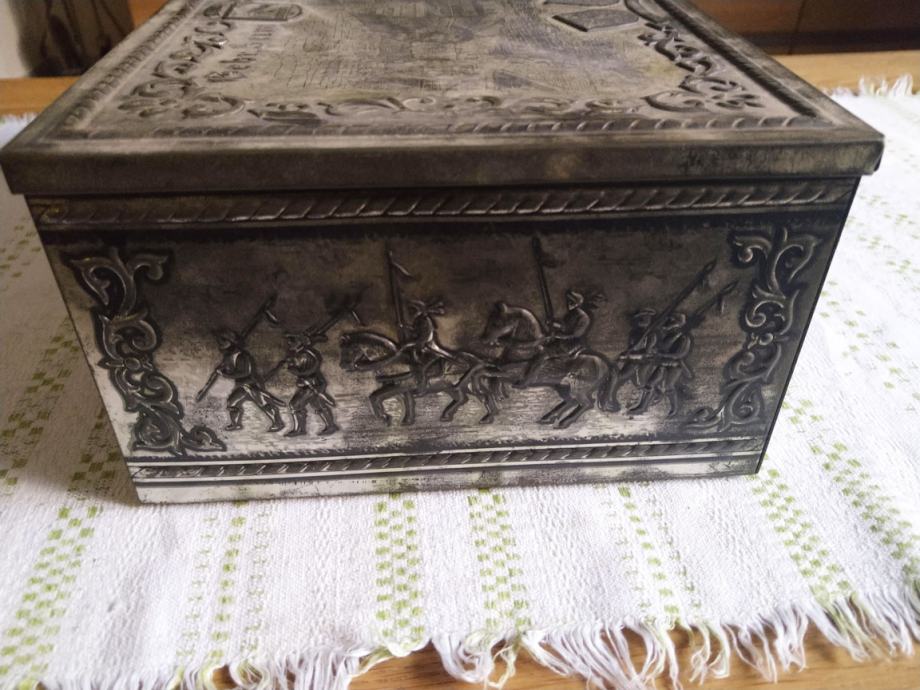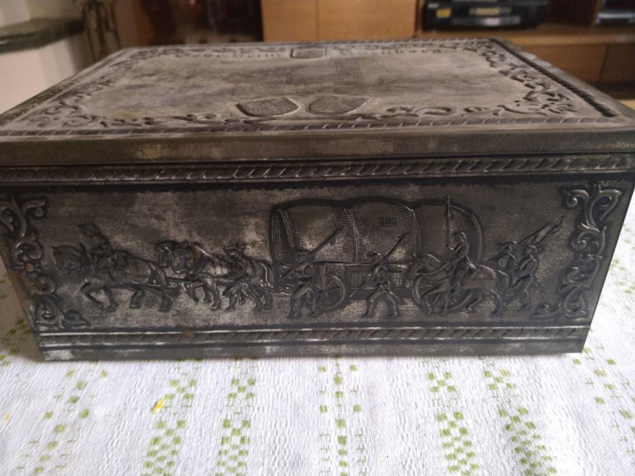 Metalna kutija, bogato ukrašena reljefnim motivima. Dimenzije su 31cm x 23 cm x 13 cm.