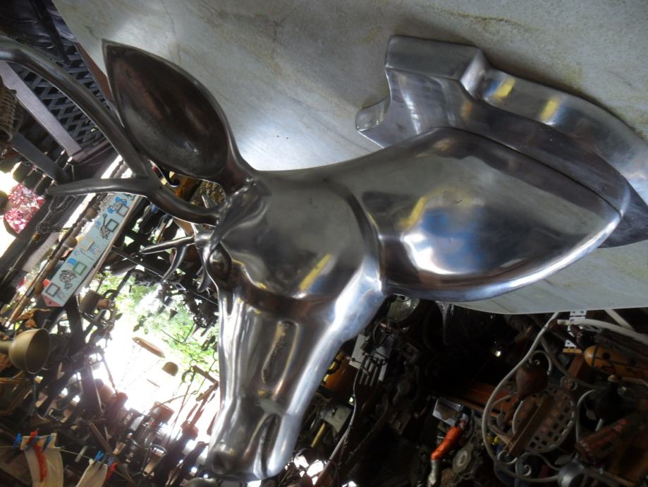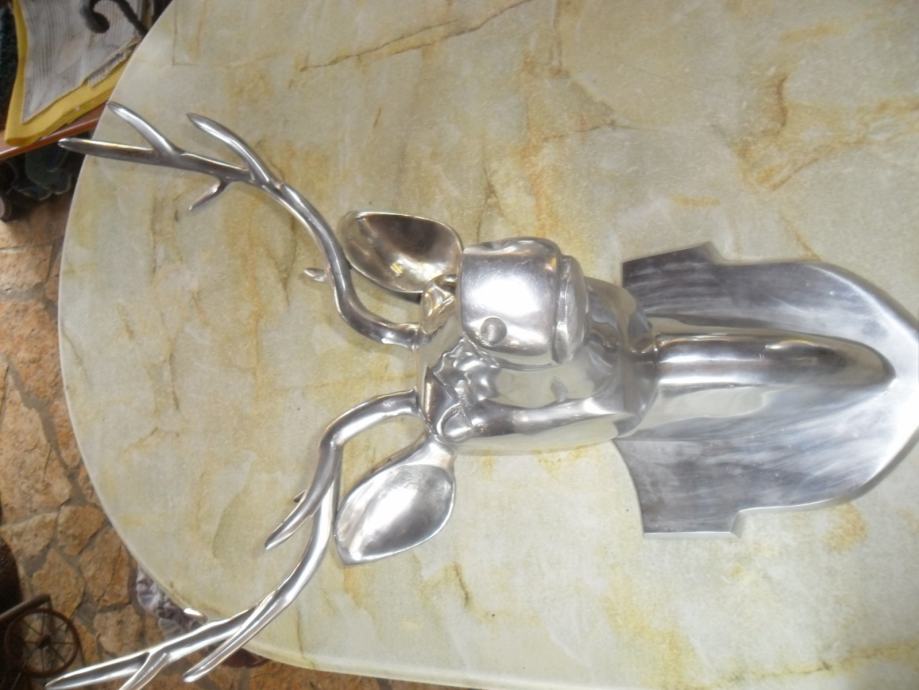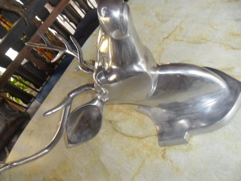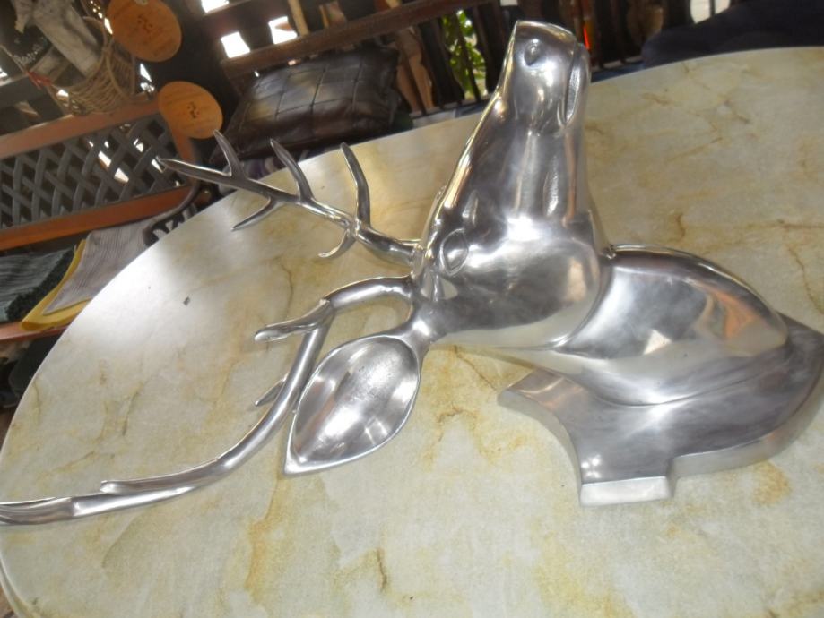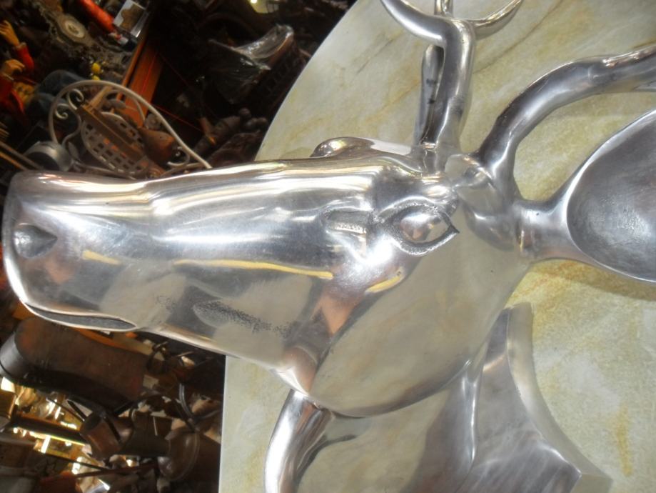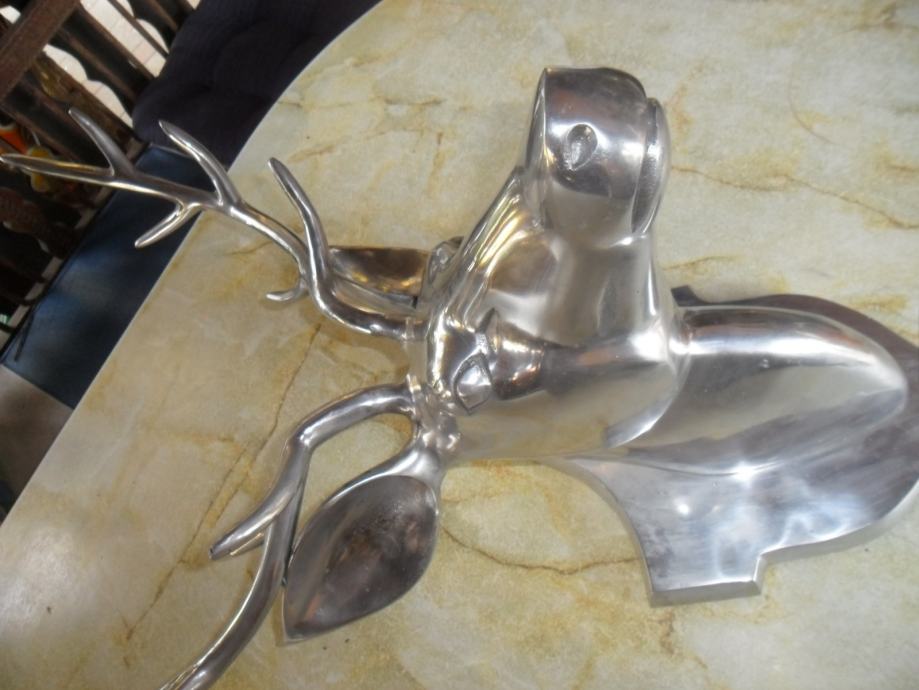 prekrasna aluminijska dekoracija skoro u prirodnoj veličini,a dimenzije su visina sa postoljem 75cm,širina na vrhu rogova je 55cm,dubina dok visi na zidu je 38cm,,,dimenzije same glave su visina sa ušima je 50cm,širina u ušima 32cm,.....navedena cijena nije fixna i uvid je u zamjene