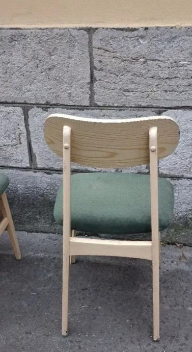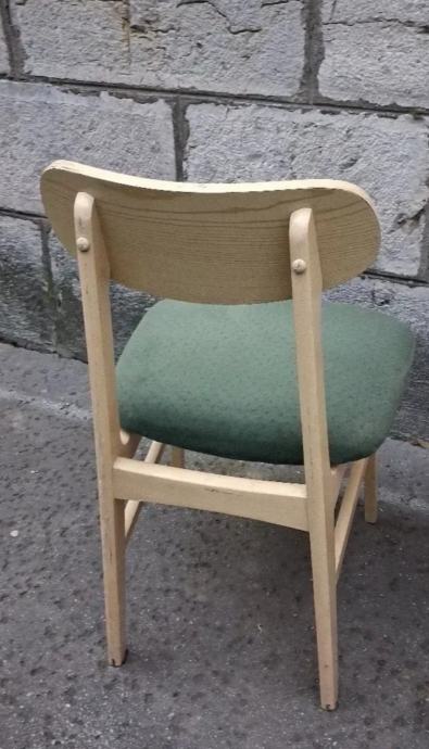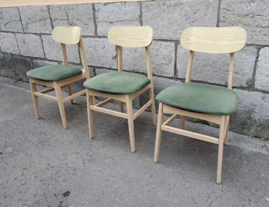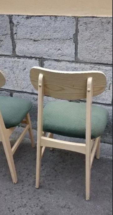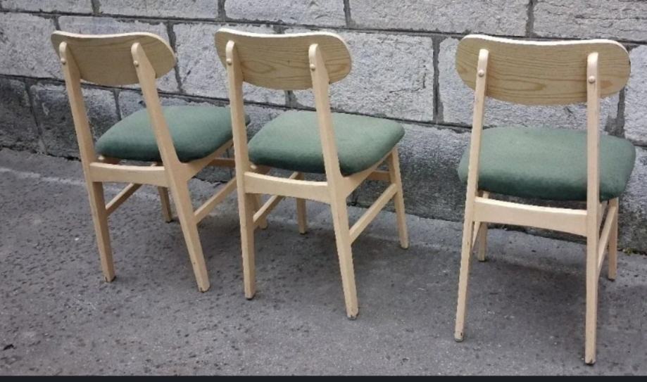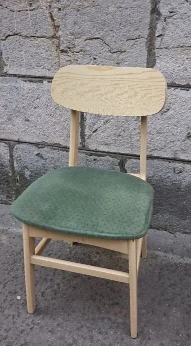 Originalne stolice u skandinavskom, mid-century stilu, izrađene od masivne bukve, sa pažljivo obnovljenom drvenom konstrukcijom i luksuznim tapaciranim sedištima u smaragdno zelenoj boji.