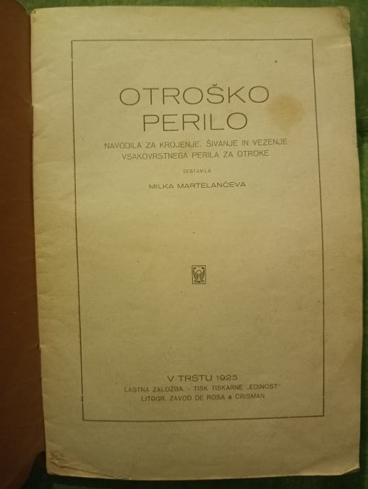 Prodajem knjižicu Otroško perilo,Milke Martelančeve, navodila za krojenje,šivanje i vezenje za djecu, Slovenski jezik, 31 stranica, Trst 1925g. Plačanje na račun ili gotovina.