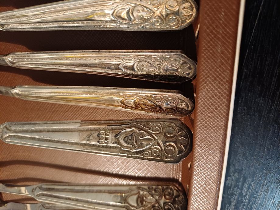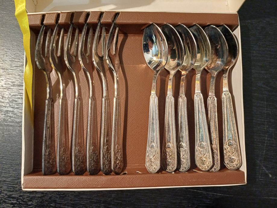 Prodajem mini beštek za jelo, za desert kavu, čaj i slatko. Šest komada malih žlica i šest komada malih viljuški. Presvučeno srebrnim slojem. Nikada korišteno. Porijeklo Poljska,i starost nepoznata, ali je preko 40 godina sigurno. Originalna kutija. Interesantno za kolekcionare. (-1)